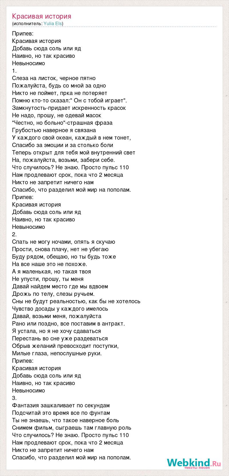Припев: Красивая история Добавь сюда соль или яд Наивно, но так красиво Невыносимо 1. Слеза на листок, черное пятно Пожалуйста, будь со мной за одно Никто не поймет, прка не потеряет Помню кто-то сказал:" Он с тобой играет". Замкнутость-придает искренность красок Не надо, прошу, не одевай масок "Честно, но больно"-страшная фраза Грубостью наверное я связана У каждого свой океан, каждый в нем тонет, Спасибо за эмоции и за столько боли Теперь открыт для тебя мой внутренний свет На, пожалуйста, возьми, забери себе. Что случилось? Не знаю. Просто пульс 110 Нам продлевают срок, пока что 2 месяца Никто не запретит ничего нам Спасибо, что разделил мой мир на пополам. Припев: Красивая история Добавь сюда соль или яд Наивно, но так красиво Невыносимо 2. Спать не могу ночами, опять я скучаю Прости, снова плачу, нет не убегаю Буду рядом, обещаю, но ты будь тоже На все наше это не похоже. А я маленькая, но такая твоя Не упусти, прошу, ты меня Давай найдем место где мы вдвоем Дрожь по телу, слезы ручьем. Сны не будут реальностью, как бы не хотелось Чувство досады у каждого имелось Давай, возьми меня, пожалуйста Рано или поздно, все поставим в антракт. Я устала, но я не хочу сдаваться Перестань во сне уже раздеваться Обрыв желаний превосходит поступки, Милые глаза, непослушные руки. Припев: Красивая история Добавь сюда соль или яд Наивно, но так красиво Невыносимо 3. Фантазия зашкаливает по секундам Подсчитай это время все по фунтам Ты не знаешь, что такое наверное боль Снимем фильм, сыграешь там главную роль Что случилось? Не знаю. Просто пульс 110 Нам продлевают срок, пока что 2 месяца Никто не запретит ничего нам Спасибо, что разделил мой мир на пополам.