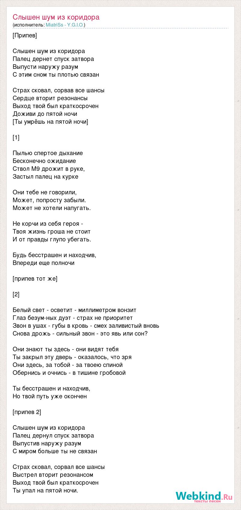 [Припев] Слышен шум из коридора Палец дернет спуск затвора Выпусти наружу разум С этим сном ты плотью связан Страх сковал, сорвав все шансы Сердце вторит резонансы Выход твой был краткосрочен Доживи до пятой ночи [Ты умрёшь на пятой ночи] [1] Пылью спертое дыхание Бесконечно ожидание Ствол М9 дрожит в руке, Застыл палец на курке Они тебе не говорили, Может, попросту забыли. Может не хотели напугать. Не корчи из себя героя - Твоя жизнь гроша не стоит И от правды глупо убегать. Будь бесстрашен и находчив, Впереди еще полночи [припев тот же] [2] Белый свет - осветит - миллиметром вонзит Глаз безум-ных дуэт - страх не приоритет Звон в ушах - губы в кровь - смех заливистый вновь Снова дрожь - сильный звон - это явь или сон? Они знают ты здесь - они видят тебя Ты закрыл эту дверь - оказалось, что зря Они здесь, за тобой - за твоею спиной Обернись и очнись - в тишине гробовой Ты бесстрашен и находчив, Но твой путь уже окончен [припев 2] Слышен шум из коридора Палец дернул спуск затвора Выпустив наружу разум С миром больше ты не связан Страх сковал, сорвал все шансы Выстрел вторит резонансом Выход твой был краткосрочен Ты упал на пятой ночи.