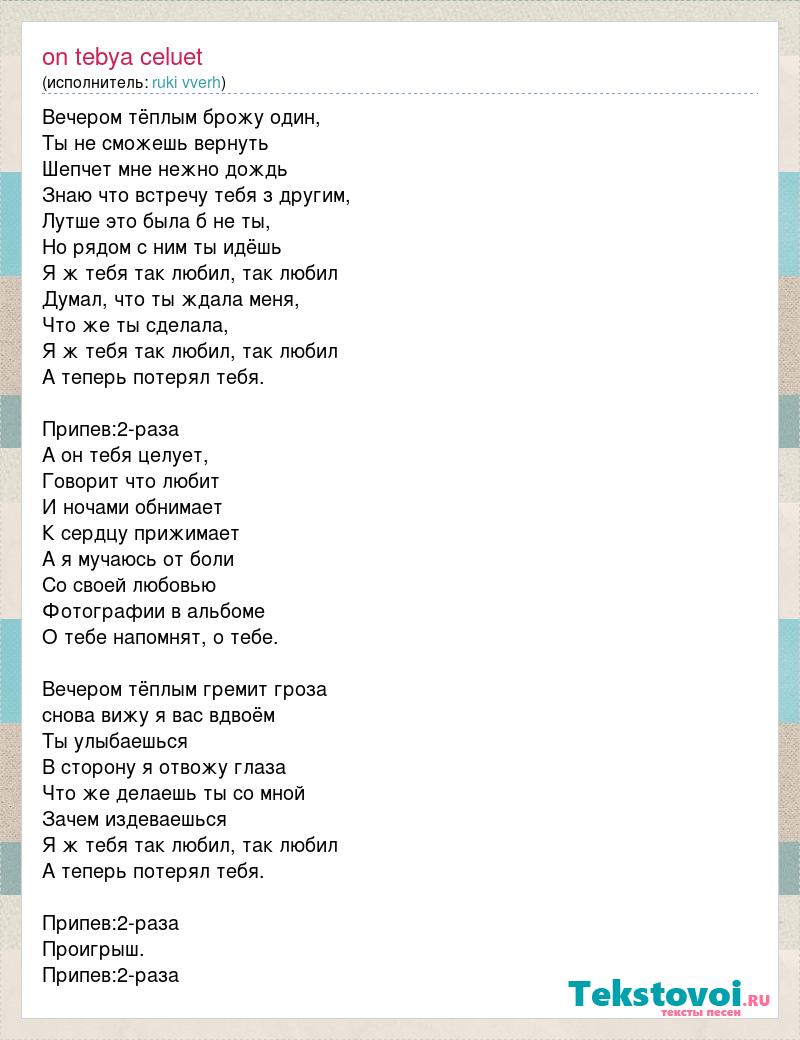 Вечером тёплым брожу один, Ты не сможешь вернуть Шепчет мне нежно дождь Знаю что встречу тебя з другим, Лутше это была б не ты, Но рядом с ним ты идёшь Я ж тебя так любил, так любил Думал, что ты ждала меня, Что же ты сделала, Я ж тебя так любил, так любил А теперь потерял тебя. Припев:2-раза А он тебя целует, Говорит что любит И ночами обнимает К сердцу прижимает А я мучаюсь от боли Со своей любовью Фотографии в альбоме О тебе напомнят, о тебе. Вечером тёплым гремит гроза снова вижу я вас вдвоём Ты улыбаешься В сторону я отвожу глаза Что же делаешь ты со мной Зачем издеваешься Я ж тебя так любил, так любил А теперь потерял тебя. Припев:2-раза Проигрыш. Припев:2-раза
