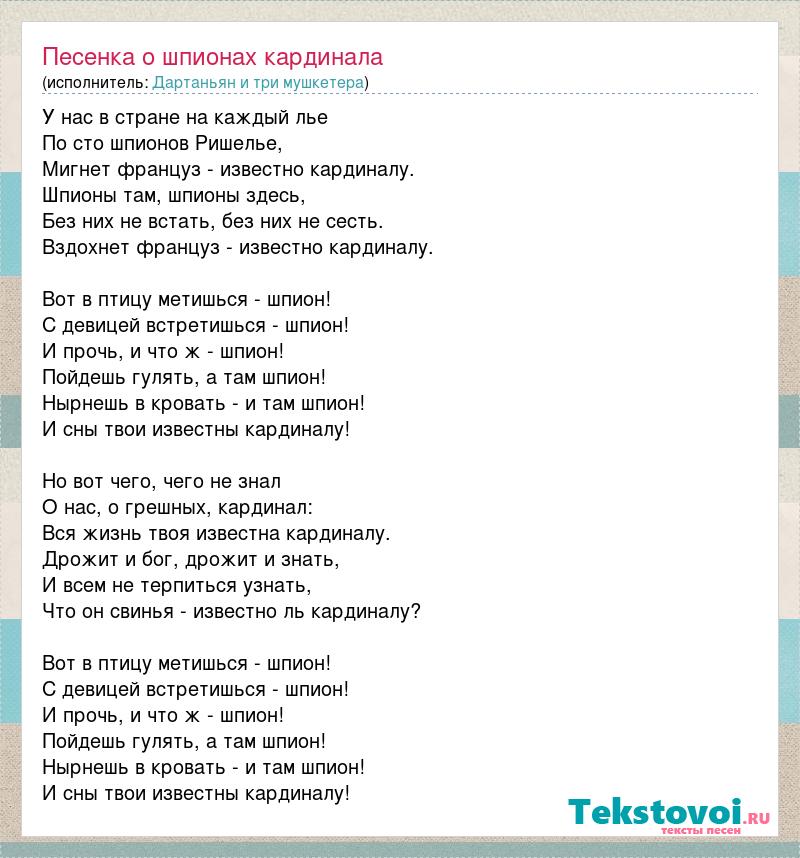 У нас в стране на каждый лье По сто шпионов Ришелье, Мигнет француз - известно кардиналу. Шпионы там, шпионы здесь, Без них не встать, без них не сесть. Вздохнет француз - известно кардиналу. Вот в птицу метишься - шпион! С девицей встретишься - шпион! И прочь, и что ж - шпион! Пойдешь гулять, а там шпион! Нырнешь в кровать - и там шпион! И сны твои известны кардиналу! Но вот чего, чего не знал О нас, о грешных, кардинал: Вся жизнь твоя известна кардиналу. Дрожит и бог, дрожит и знать, И всем не терпиться узнать, Что он свинья - известно ль кардиналу? Вот в птицу метишься - шпион! С девицей встретишься - шпион! И прочь, и что ж - шпион! Пойдешь гулять, а там шпион! Нырнешь в кровать - и там шпион! И сны твои известны кардиналу!