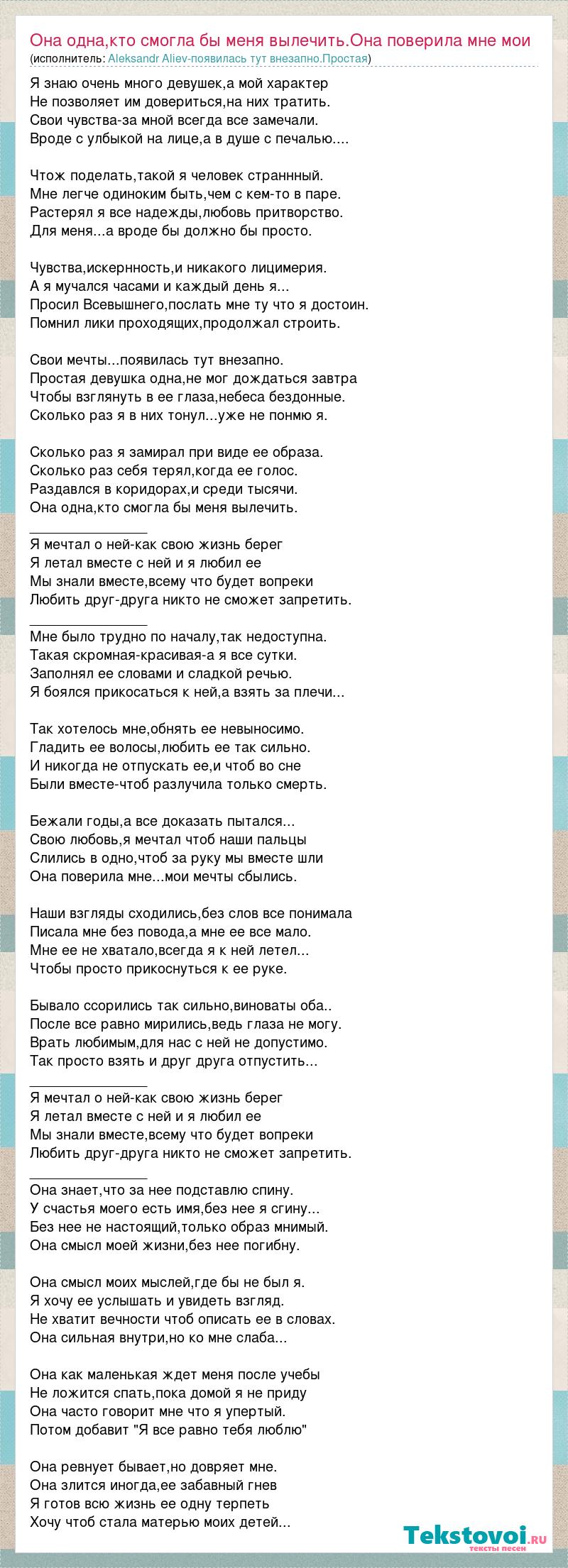 Главная→Исполнители→Aleksandr Aliev-появилась тут внезапно.Простая→Она одна,кто смогла бы меня вылечить.Она поверила мне мои