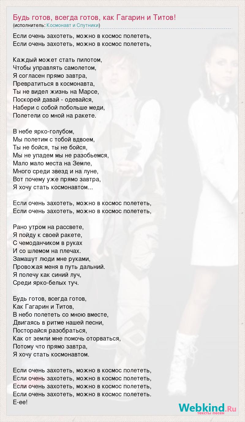 Если очень захотеть, можно в космос полететь, Если очень захотеть, можно в космос полететь, Каждый может стать пилотом, Чтобы управлять самолетом, Я согласен прямо завтра, Превратиться в космонавта, Ты не видел жизнь на Марсе, Поскорей давай - одевайся, Набери с собой побольше меди, Полетели со мной на ракете. В небе ярко-голубом, Мы полетим с тобой вдвоем, Ты не бойся, ты не бойся, Мы не упадем мы не разобьемся, Мало мало места на Земле, Много среди звезд и на луне, Вот почему уже прямо завтра, Я хочу стать космонавтом... Если очень захотеть, можно в космос полететь, Если очень захотеть, можно в космос полететь, Рано утром на рассвете, Я пойду к своей ракете, С чемоданчиком в руках И со шлемом на плечах. Замашут люди мне руками, Провожая меня в путь дальний. Я полечу как синий луч, Среди ярко-белых туч. Будь готов, всегда готов, Как Гагарин и Титов, В небо полететь со мною вместе, Двигаясь в ритме нашей песни, Посторайся разобраться, Как от земли мне помочь оторваться, Потому что прямо завтра, Я хочу стать космонавтом. Если очень захотеть, можно в космос полететь, Если очень захотеть, можно в космос полететь, Если очень захотеть, можно в космос полететь, Если очень захотеть, можно в космос полететь. Е-ее!