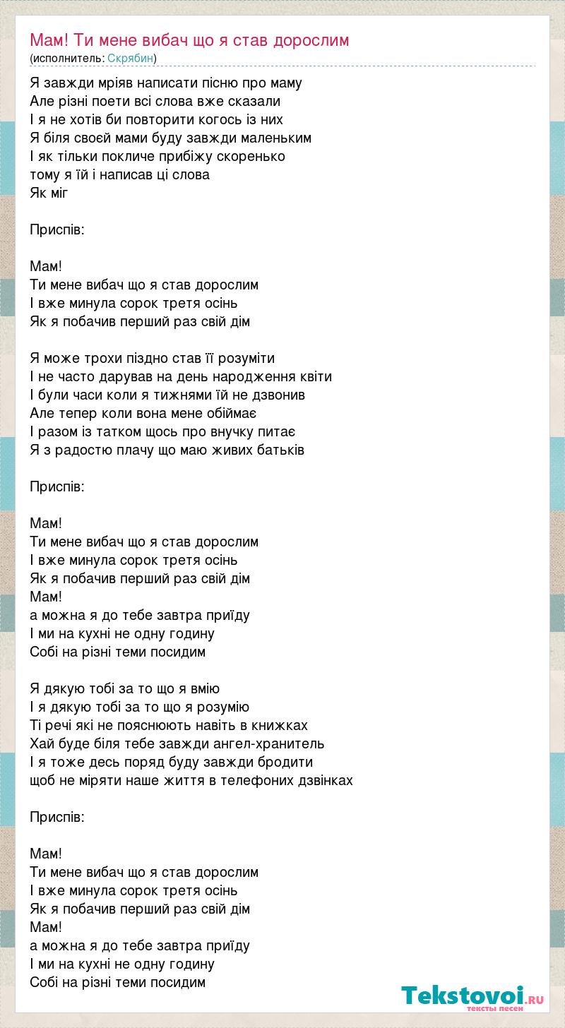 Я завжди мрiяв написати пiсню про маму Але рiзнi поети всi слова вже сказали I я не хотiв би повторити когось iз них Я бiля своєй мами буду завжди маленьким I як тiльки покличе прибiжу скоренько тому я їй i написав цi слова Як мiг Приспiв: Мам! Ти мене вибач що я став дорослим I вже минула сорок третя осiнь Як я побачив перший раз свiй дiм Я може трохи пiздно став її розумiти I не часто дарував на день народження квiти I були часи коли я тижнями їй не дзвонив Але тепер коли вона мене обiймає I разом iз татком щось про внучку питає Я з радостю плачу що маю живих батькiв Приспiв: Мам! Ти мене вибач що я став дорослим I вже минула сорок третя осiнь Як я побачив перший раз свiй дiм Мам! а можна я до тебе завтра приїду I ми на кухнi не одну годину Собi на рiзнi теми посидим Я дякую тобi за то що я вмiю I я дякую тобi за то що я розумiю Тi речi якi не пояснюють навiть в книжках Хай буде бiля тебе завжди ангел-хранитель I я тоже десь поряд буду завжди бродити щоб не мiряти наше життя в телефоних дзвiнках Приспiв: Мам! Ти мене вибач що я став дорослим I вже минула сорок третя осiнь Як я побачив перший раз свiй дiм Мам! а можна я до тебе завтра приїду I ми на кухнi не одну годину Собi на рiзнi теми посидим
