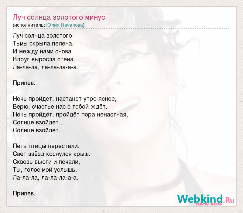 Луч солнца золотого Тьмы скрыла пелена. И между нами снова Вдруг выросла стена. Ла-ла-ла, ла-ла-ла-а-а. Припев: Ночь пройдет, настанет утро ясное, Верю, счастье нас с тобой ждёт. Ночь пройдёт, пройдёт пора ненастная, Солнце взойдет... Солнце взойдет. Петь птицы перестали. Свет звёзд коснулся крыш. Сквозь вьюги и печали, Ты, голос мой услышь. Ла-ла-ла, ла-ла-ла-а-а. Припев.