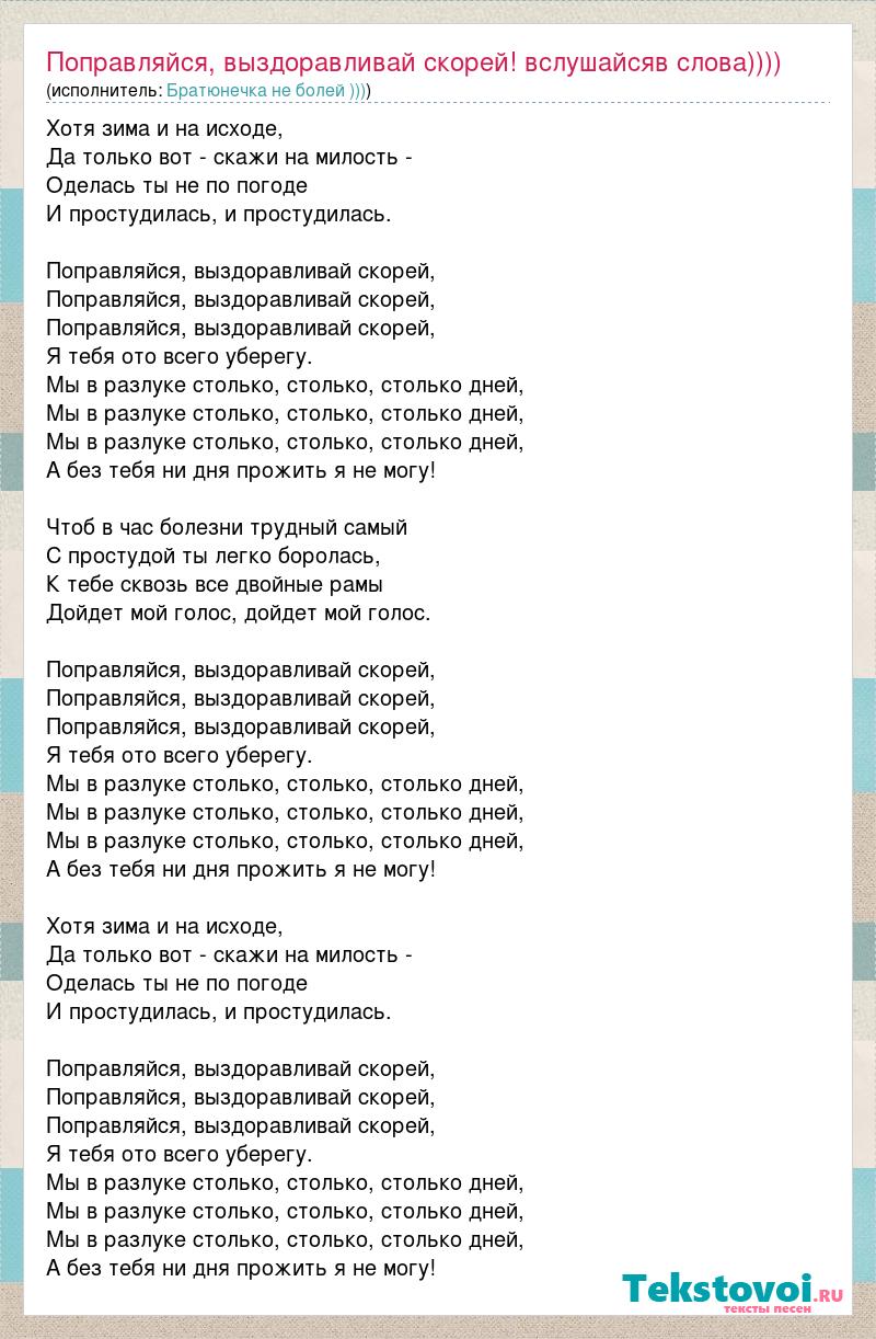 Хотя зима и на исходе, Да только вот - скажи на милость - Оделась ты не по погоде И простудилась, и простудилась. Поправляйся, выздоравливай скорей, Поправляйся, выздоравливай скорей, Поправляйся, выздоравливай скорей, Я тебя ото всего уберегу. Мы в разлуке столько, столько, столько дней, Мы в разлуке столько, столько, столько дней, Мы в разлуке столько, столько, столько дней, А без тебя ни дня прожить я не могу! Чтоб в час болезни трудный самый С простудой ты легко боролась, К тебе сквозь все двойные рамы Дойдет мой голос, дойдет мой голос. Поправляйся, выздоравливай скорей, Поправляйся, выздоравливай скорей, Поправляйся, выздоравливай скорей, Я тебя ото всего уберегу. Мы в разлуке столько, столько, столько дней, Мы в разлуке столько, столько, столько дней, Мы в разлуке столько, столько, столько дней, А без тебя ни дня прожить я не могу! Хотя зима и на исходе, Да только вот - скажи на милость - Оделась ты не по погоде И простудилась, и простудилась. Поправляйся, выздоравливай скорей, Поправляйся, выздоравливай скорей, Поправляйся, выздоравливай скорей, Я тебя ото всего уберегу. Мы в разлуке столько, столько, столько дней, Мы в разлуке столько, столько, столько дней, Мы в разлуке столько, столько, столько дней, А без тебя ни дня прожить я не могу!