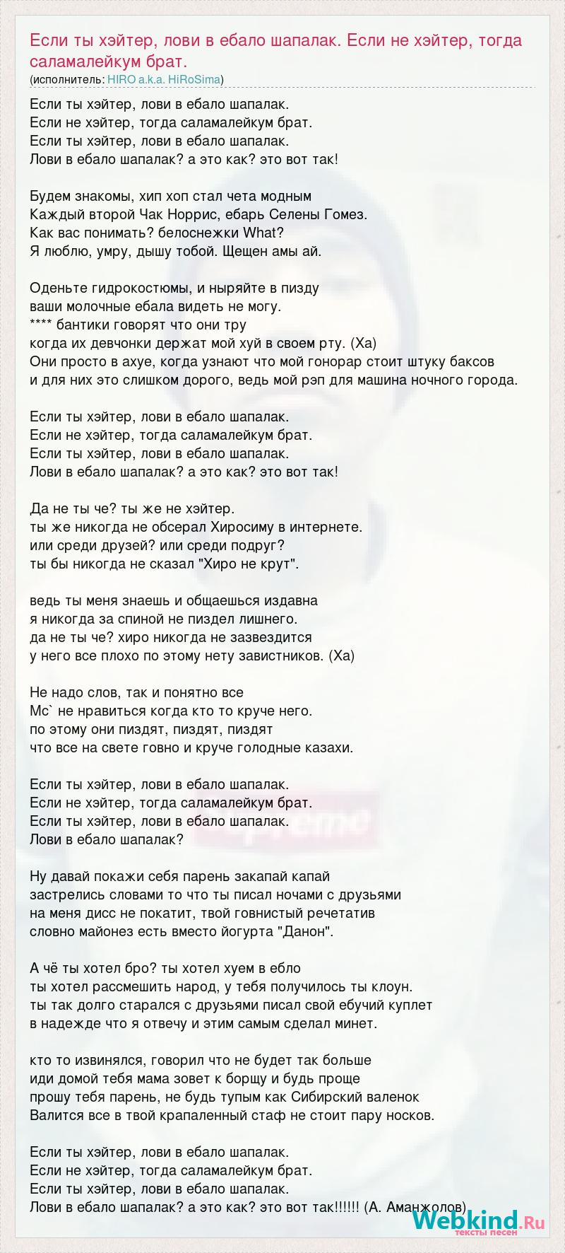 Если ты хэйтер, лови в ебало шапалак. Если не хэйтер, тогда саламалейкум брат. Если ты хэйтер, лови в ебало шапалак. Лови в ебало шапалак? а это как? это вот так! Будем знакомы, хип хоп стал чета модным Каждый второй Чак Норрис, ебарь Селены Гомез. Как вас понимать? белоснежки What? Я люблю, умру, дышу тобой. Щещен амы ай. Оденьте гидрокостюмы, и ныряйте в пизду ваши молочные ебала видеть не могу. **** бантики говорят что они тру когда их девчонки держат мой хуй в своем рту. (Ха) Они просто в ахуе, когда узнают что мой гонорар стоит штуку баксов и для них это слишком дорого, ведь мой рэп для машина ночного города. Если ты хэйтер, лови в ебало шапалак. Если не хэйтер, тогда саламалейкум брат. Если ты хэйтер, лови в ебало шапалак. Лови в ебало шапалак? а это как? это вот так! Да не ты че? ты же не хэйтер. ты же никогда не обсерал Хиросиму в интернете. или среди друзей? или среди подруг? ты бы никогда не сказал "Хиро не крут". ведь ты меня знаешь и общаешься издавна я никогда за спиной не пиздел лишнего. да не ты че? хиро никогда не зазвездится у него все плохо по этому нету завистников. (Ха) Не надо слов, так и понятно все Мс` не нравиться когда кто то круче него. по этому они пиздят, пиздят, пиздят что все на свете говно и круче голодные казахи. Если ты хэйтер, лови в ебало шапалак. Если не хэйтер, тогда саламалейкум брат. Если ты хэйтер, лови в ебало шапалак. Лови в ебало шапалак? Ну давай покажи себя парень закапай капай застрелись словами то что ты писал ночами с друзьями на меня дисс не покатит, твой говнистый речетатив словно майонез есть вместо йогурта "Данон". А чё ты хотел бро? ты хотел хуем в ебло ты хотел рассмешить народ, у тебя получилось ты клоун. ты так долго старался с друзьями писал свой ебучий куплет в надежде что я отвечу и этим самым сделал минет. кто то извинялся, говорил что не будет так больше иди домой тебя мама зовет к борщу и будь проще прошу тебя парень, не будь тупым как Сибирский валенок Валится все в твой крапаленный стаф не стоит пару носков. Если ты хэйтер, лови в ебало шапалак. Если не хэйтер, тогда саламалейкум брат. Если ты хэйтер, лови в ебало шапалак. Лови в ебало шапалак? а это как? это вот так!!!!!! (А. Аманжолов)