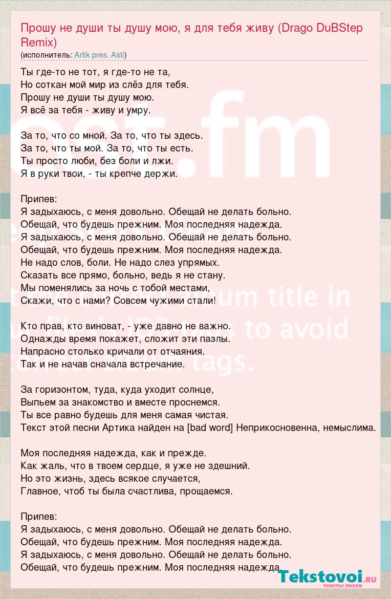 Ты где-то не тот, я где-то не та, Но соткан мой мир из слёз для тебя. Прошу не души ты душу мою. Я всё за тебя - живу и умру. За то, что со мной. За то, что ты здесь. За то, что ты мой. За то, что ты есть. Ты просто люби, без боли и лжи. Я в руки твои, - ты крепче держи. Припев: Я задыхаюсь, с меня довольно. Обещай не делать больно. Обещай, что будешь прежним. Моя последняя надежда. Я задыхаюсь, с меня довольно. Обещай не делать больно. Обещай, что будешь прежним. Моя последняя надежда. Не надо слов, боли. Не надо слез упрямых. Сказать все прямо, больно, ведь я не стану. Мы поменялись за ночь с тобой местами, Скажи, что с нами? Совсем чужими стали! Кто прав, кто виноват, - уже давно не важно. Однажды время покажет, сложит эти пазлы. Напрасно столько кричали от отчаяния. Так и не начав сначала встречание. За горизонтом, туда, куда уходит солнце, Выпьем за знакомство и вместе проснемся. Ты все равно будешь для меня самая чистая. Текст этой песни Артика найден на [bad word] Неприкосновенна, немыслима. Моя последняя надежда, как и прежде. Как жаль, что в твоем сердце, я уже не здешний. Но это жизнь, здесь всякое случается, Главное, чтоб ты была счастлива, прощаемся. Припев: Я задыхаюсь, с меня довольно. Обещай не делать больно. Обещай, что будешь прежним. Моя последняя надежда. Я задыхаюсь, с меня довольно. Обещай не делать больно. Обещай, что будешь прежним. Моя последняя надежда.
