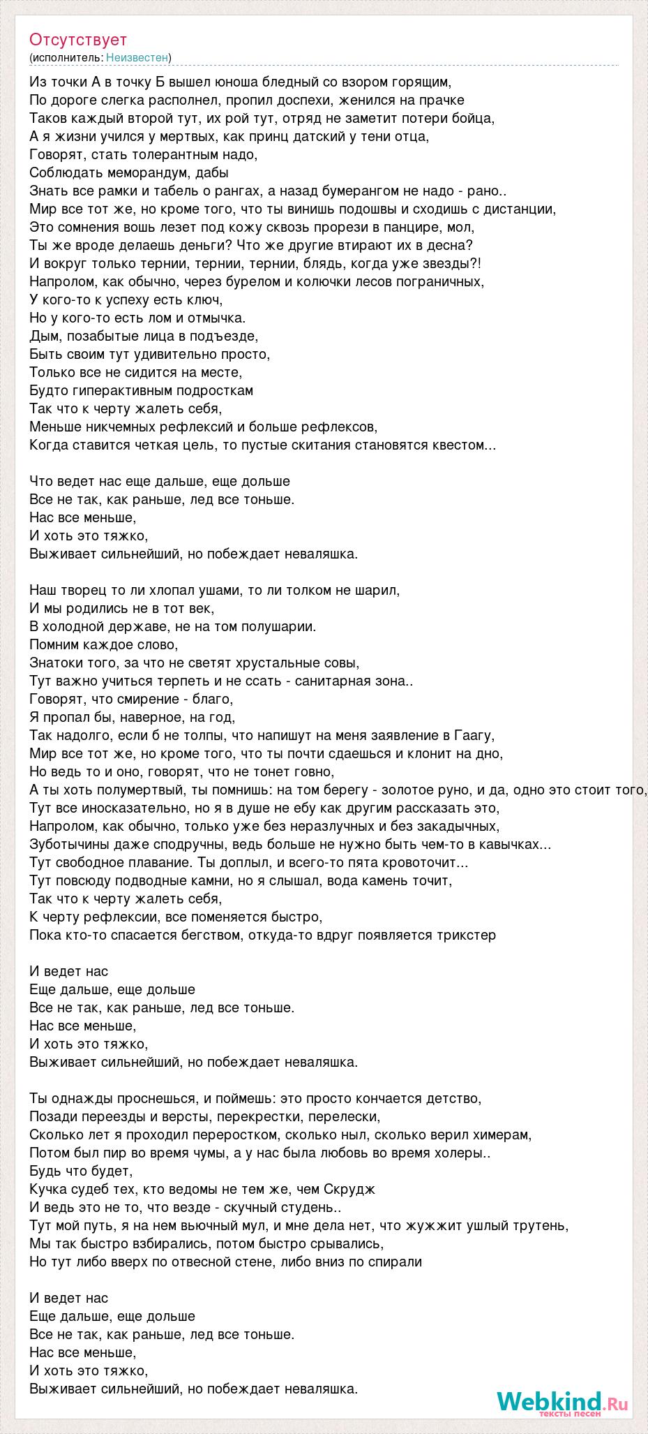 Из точки А в точку Б вышел юноша бледный со взором горящим, По дороге слегка располнел, пропил доспехи, женился на прачке Таков каждый второй тут, их рой тут, отряд не заметит потери бойца, А я жизни учился у мертвых, как принц датский у тени отца, Говорят, стать толерантным надо, Соблюдать меморандум, дабы Знать все рамки и табель о рангах, а назад бумерангом не надо - рано.. Мир все тот же, но кроме того, что ты винишь подошвы и сходишь с дистанции, Это сомнения вошь лезет под кожу сквозь прорези в панцире, мол, Ты же вроде делаешь деньги? Что же другие втирают их в десна? И вокруг только тернии, тернии, тернии, блядь, когда уже звезды?! Напролом, как обычно, через бурелом и колючки лесов пограничных, У кого-то к успеху есть ключ, Но у кого-то есть лом и отмычка. Дым, позабытые лица в подъезде, Быть своим тут удивительно просто, Только все не сидится на месте, Будто гиперактивным подросткам Так что к черту жалеть себя, Меньше никчемных рефлексий и больше рефлексов, Когда ставится четкая цель, то пустые скитания становятся квестом... Что ведет нас еще дальше, еще дольше Все не так, как раньше, лед все тоньше. Нас все меньше, И хоть это тяжко, Выживает сильнейший, но побеждает неваляшка. Наш творец то ли хлопал ушами, то ли толком не шарил, И мы родились не в тот век, В холодной державе, не на том полушарии. Помним каждое слово, Знатоки того, за что не светят хрустальные совы, Тут важно учиться терпеть и не ссать - санитарная зона.. Говорят, что смирение - благо, Я пропал бы, наверное, на год, Так надолго, если б не толпы, что напишут на меня заявление в Гаагу, Мир все тот же, но кроме того, что ты почти сдаешься и клонит на дно, Но ведь то и оно, говорят, что не тонет говно, А ты хоть полумертвый, ты помнишь: на том берегу - золотое руно, и да, одно это стоит того, Тут все иносказательно, но я в душе не ебу как другим рассказать это, Напролом, как обычно, только уже без неразлучных и без закадычных, Зуботычины даже сподручны, ведь больше не нужно быть чем-то в кавычках... Тут свободное плавание. Ты доплыл, и всего-то пята кровоточит... Тут повсюду подводные камни, но я слышал, вода камень точит, Так что к черту жалеть себя, К черту рефлексии, все поменяется быстро, Пока кто-то спасается бегством, откуда-то вдруг появляется трикстер И ведет нас Еще дальше, еще дольше Все не так, как раньше, лед все тоньше. Нас все меньше, И хоть это тяжко, Выживает сильнейший, но побеждает неваляшка. Ты однажды проснешься, и поймешь: это просто кончается детство, Позади переезды и версты, перекрестки, перелески, Сколько лет я проходил переростком, сколько ныл, сколько верил химерам, Потом был пир во время чумы, а у нас была любовь во время холеры.. Будь что будет, Кучка судеб тех, кто ведомы не тем же, чем Скрудж И ведь это не то, что везде - скучный студень.. Тут мой путь, я на нем вьючный мул, и мне дела нет, что жужжит ушлый трутень, Мы так быстро взбирались, потом быстро срывались, Но тут либо вверх по отвесной стене, либо вниз по спирали И ведет нас Еще дальше, еще дольше Все не так, как раньше, лед все тоньше. Нас все меньше, И хоть это тяжко, Выживает сильнейший, но побеждает неваляшка.