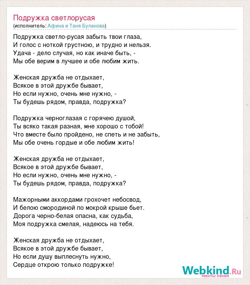 Подружка светло-русая забыть твои глаза, И голос с ноткой грустною, и трудно и нельзя. Удача - дело случая, но как иначе быть, - Мы обе верим в лучшее и обе любим жить. Женская дружба не отдыхает, Всякое в этой дружбе бывает, Но если нужно, очень мне нужно, - Ты будешь рядом, правда, подружка? Подружка черноглазая с горячею душой, Ты всяко такая разная, мне хорошо с тобой! Что вместе было пройдено, не спеть и не забыть, Мы обе очень гордые и обе любим жить! Женская дружба не отдыхает, Всякое в этой дружбе бывает, Но если нужно, очень мне нужно, - Ты будешь рядом, правда, подружка? Мажорными аккордами грохочет небосвод, И белою смородиной по мокрой крыше бьет. Дорога черно-белая опасна, как судьба, Моя подружка смелая, надеюсь на тебя. Женская дружба не отдыхает, Всякое в этой дружбе бывает, Но если душу выплеснуть нужно, Сердце открою только подружке!