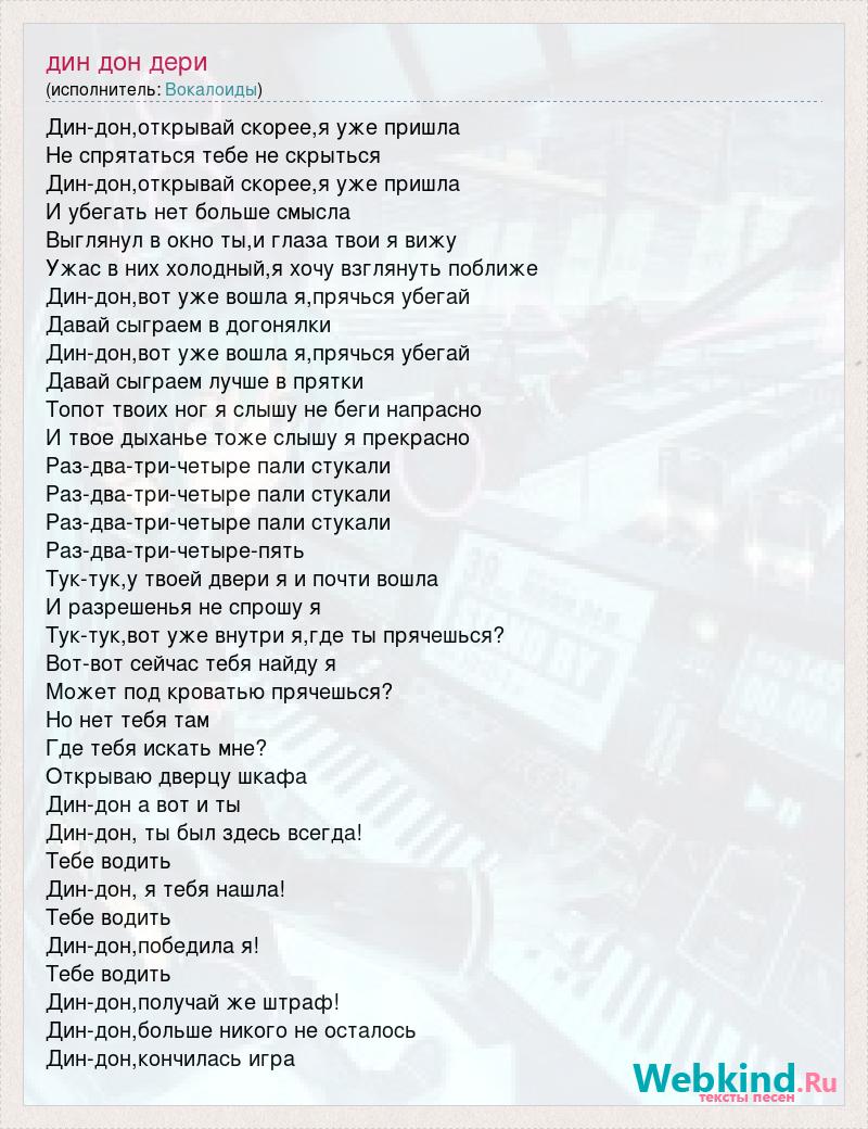 Дин-дон,открывай скорее,я уже пришла Не спрятаться тебе не скрыться Дин-дон,открывай скорее,я уже пришла И убегать нет больше смысла Выглянул в окно ты,и глаза твои я вижу Ужас в них холодный,я хочу взглянуть поближе Дин-дон,вот уже вошла я,прячься убегай Давай сыграем в догонялки Дин-дон,вот уже вошла я,прячься убегай Давай сыграем лучше в прятки Топот твоих ног я слышу не беги напрасно И твое дыханье тоже слышу я прекрасно Раз-два-три-четыре пали стукали Раз-два-три-четыре пали стукали Раз-два-три-четыре пали стукали Раз-два-три-четыре-пять Тук-тук,у твоей двери я и почти вошла И разрешенья не спрошу я Тук-тук,вот уже внутри я,где ты прячешься? Вот-вот сейчас тебя найду я Может под кроватью прячешься? Но нет тебя там Где тебя искать мне? Открываю дверцу шкафа Дин-дон а вот и ты Дин-дон, ты был здесь всегда! Тебе водить Дин-дон, я тебя нашла! Тебе водить Дин-дон,победила я! Тебе водить Дин-дон,получай же штраф! Дин-дон,больше никого не осталось Дин-дон,кончилась игра