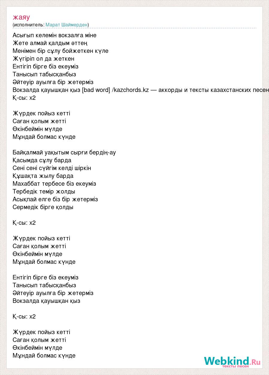 Асығып келемін вокзалға міне Жете алмай қалдым әттең Менімен бір сұлу бойжеткен күле Жүгіріп ол да жеткен Ентігіп бірге біз екеуміз Танысып табысқанбыз Әйтеуір ауылға бір жетерміз Вокзалда қауышқан қыз [bad word] /kazchords.kz — аккорды и тексты казахстанских песен Қ-сы: х2 Жүрдек пойыз кетті Саған қолым жетті Өкінбеймін мүлде Мұндай болмас күнде Байқалмай уақытым сырғи бердің-ау Қасымда сұлу барда Сені сені сүйгім келді шіркін Құшақта жылу барда Махаббат тербесе біз екеуміз Тербедік темір жолды Асықпай елге біз бір жетерміз Сермедік бірге қолды Қ-сы: х2 Жүрдек пойыз кетті Саған қолым жетті Өкінбеймін мүлде Мұндай болмас күнде Ентігіп бірге біз екеуміз Танысып табысқанбыз Әйтеуір ауылға бір жетерміз Вокзалда қауышқан қыз Қ-сы: х2 Жүрдек пойыз кетті Саған қолым жетті Өкінбеймін мүлде Мұндай болмас күнде