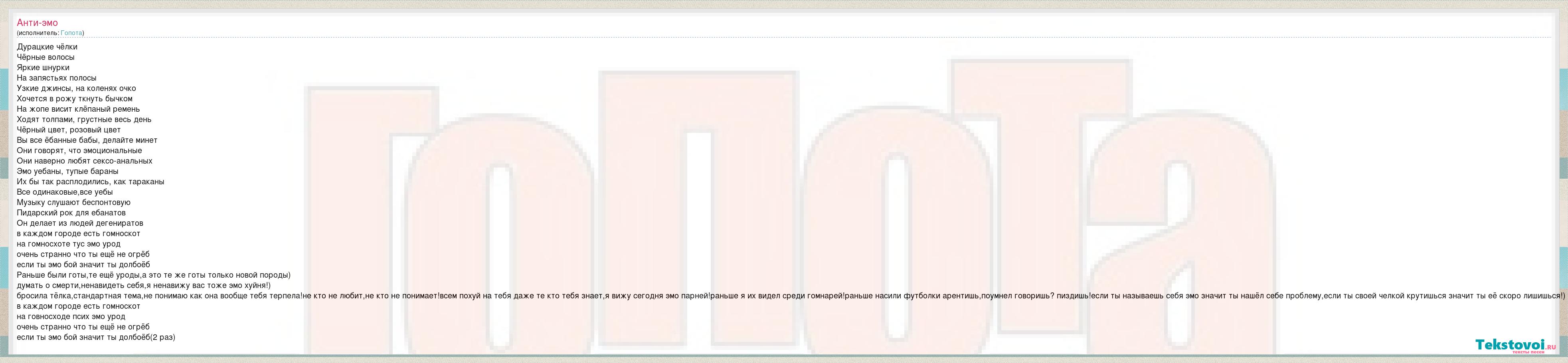 Дурацкие чёлки Чёрные волосы Яркие шнурки На запястьях полосы Узкие джинсы, на коленях очко Хочется в рожу ткнуть бычком На жопе висит клёпаный ремень Ходят толпами, грустные весь день Чёрный цвет, розовый цвет Вы все ёбанные бабы, делайте минет Они говорят, что эмоциональные Они наверно любят сексо-анальных Эмо уебаны, тупые бараны Их бы так расплодились, как тараканы Все одинаковые,все уебы Музыку слушают беспонтовую Пидарский рок для ебанатов Он делает из людей дегениратов в каждом городе есть гомноскот на гомносхоте тус эмо урод очень странно что ты ещё не огрёб если ты эмо бой значит ты долбоёб Раньше были готы,те ещё уроды,а это те же готы только новой породы) думать о смерти,ненавидеть себя,я ненавижу вас тоже эмо хуйня!) бросила тёлка,стандартная тема,не понимаю как она вообще тебя терпела!не кто не любит,не кто не понимает!всем похуй на тебя даже те кто тебя знает,я вижу сегодня эмо парней!раньше я их видел среди гомнарей!раньше насили футболки арентишь,поумнел говоришь? пиздишь!если ты называешь себя эмо значит ты нашёл себе проблему,если ты своей челкой крутишься значит ты её скоро лишишься!) в каждом городе есть гомноскот на говносходе псих эмо урод очень странно что ты ещё не огрёб если ты эмо бой значит ты долбоёб(2 раз)