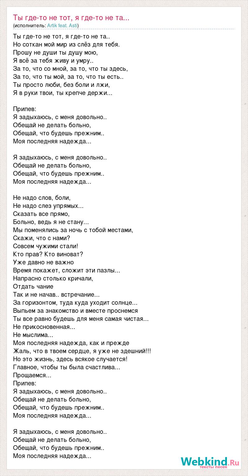 Ты где-то не тот, я где-то не та.. Но соткан мой мир из слёз для тебя. Прошу не души ты душу мою, Я всё за тебя живу и умру.. За то, что со мной, за то, что ты здесь, За то, что ты мой, за то, что ты есть.. Ты просто люби, без боли и лжи, Я в руки твои, ты крепче держи... Припев: Я задыхаюсь, с меня довольно.. Обещай не делать больно, Обещай, что будешь прежним.. Моя последняя надежда... Я задыхаюсь, с меня довольно.. Обещай не делать больно, Обещай, что будешь прежним.. Моя последняя надежда... Не надо слов, боли, Не надо слез упрямых... Сказать все прямо, Больно, ведь я не стану... Мы поменялись за ночь с тобой местами, Скажи, что с нами? Совсем чужими стали! Кто прав? Кто виноват? Уже давно не важно Время покажет, сложит эти пазлы... Напрасно столько кричали, Отдать чание Так и не начав.. встречание... За горизонтом, туда куда уходит солнце... Выпьем за знакомство и вместе проснемся Ты все равно будешь для меня самая чистая... Не прикосновенная... Не мыслима... Моя последняя надежда, как и прежде Жаль, что в твоем сердце, я уже не здешний!!! Но это жизнь, здесь всякое случается! Главное, чтобы ты была счастлива... Прощаемся... Припев: Я задыхаюсь, с меня довольно.. Обещай не делать больно, Обещай, что будешь прежним.. Моя последняя надежда... Я задыхаюсь, с меня довольно.. Обещай не делать больно, Обещай, что будешь прежним.. Моя последняя надежда...