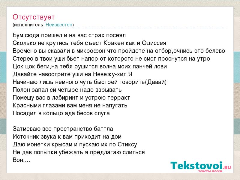 Бум,сюда пришел и на вас страх посеял Сколько не крутись тебя съест Кракен как и Одиссея Времено вы сказали в микрофон что пройдете на отбор,очнись это белево Стерео в твои уши бьет напор от которого не смог проснутся на утро Цок цок беги,на тебя рушится волна моих панчей лови Давайте навострите уши на Невежу-хит Я Начинаю лишь немного чуть быстрей говорить(Давай) Полон запал си четыре надо взрывать Помещу вас в лабиринт и устрою терракт Красными глазами вам меня не напугать Посадил в кольцо ада бесов слуга Затмеваю все пространство баттла Источник звука к вам приходит на дом Даю монетки крысам и пускаю их по Стиксу Не дав попытки убежать я предлагаю слиться Вон....