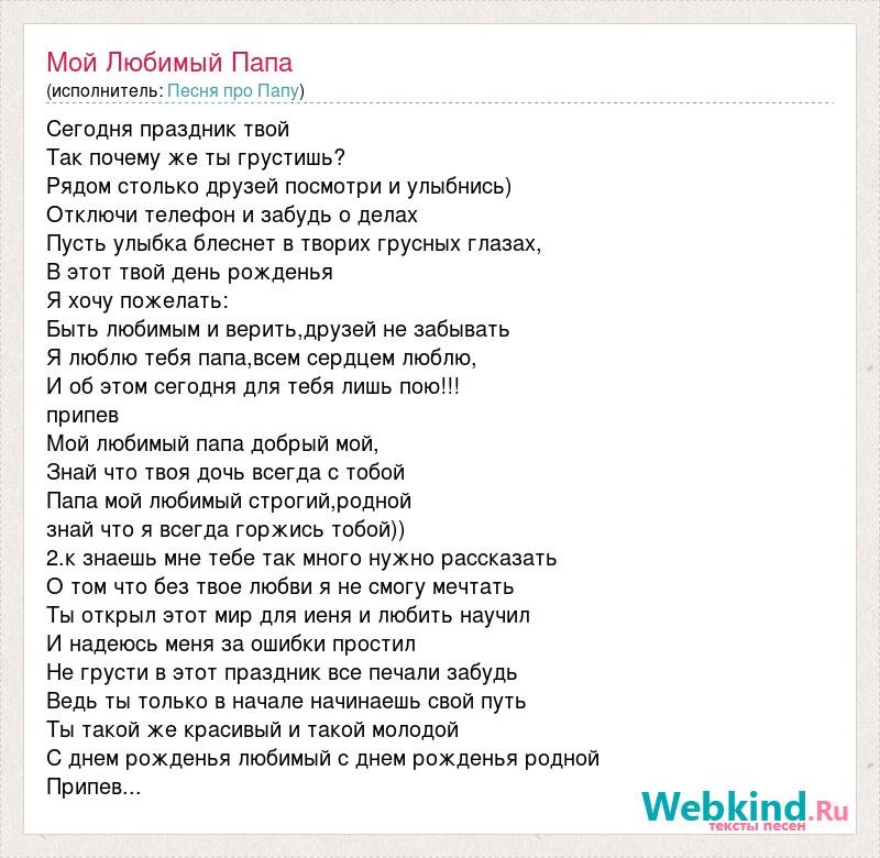 Сегодня праздник твой Так почему же ты грустишь? Рядом столько друзей посмотри и улыбнись) Отключи телефон и забудь о делах Пусть улыбка блеснет в творих грусных глазах, В этот твой день рожденья Я хочу пожелать: Быть любимым и верить,друзей не забывать Я люблю тебя папа,всем сердцем люблю, И об этом сегодня для тебя лишь пою!!! припев Мой любимый папа добрый мой, Знай что твоя дочь всегда с тобой Папа мой любимый строгий,родной знай что я всегда горжись тобой)) 2.к знаешь мне тебе так много нужно рассказать О том что без твое любви я не смогу мечтать Ты открыл этот мир для иеня и любить научил И надеюсь меня за ошибки простил Не грусти в этот праздник все печали забудь Ведь ты только в начале начинаешь свой путь Ты такой же красивый и такой молодой С днем рожденья любимый с днем рожденья родной Припев...