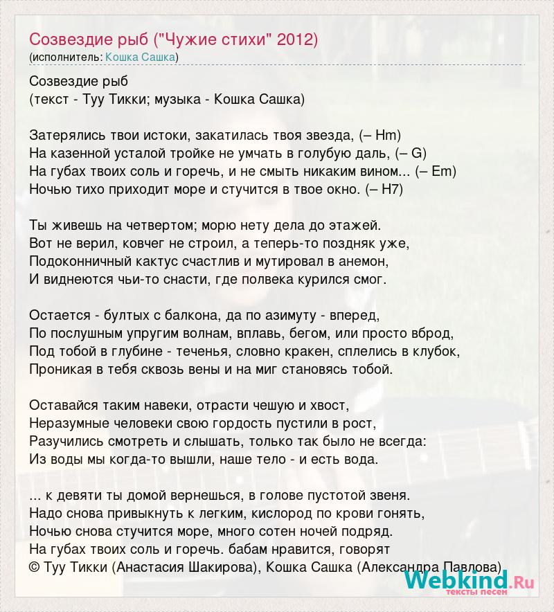Созвездие рыб (текст - Туу Тикки; музыка - Кошка Сашка) Затерялись твои истоки, закатилась твоя звезда, (– Hm) На казенной усталой тройке не умчать в голубую даль, (– G) На губах твоих соль и горечь, и не смыть никаким вином... (– Em) Ночью тихо приходит море и стучится в твое окно. (– H7) Ты живешь на четвертом; морю нету дела до этажей. Вот не верил, ковчег не строил, а теперь-то поздняк уже, Подоконничный кактус счастлив и мутировал в анемон, И виднеются чьи-то снасти, где полвека курился смог. Остается - бултых с балкона, да по азимуту - вперед, По послушным упругим волнам, вплавь, бегом, или просто вброд, Под тобой в глубине - теченья, словно кракен, сплелись в клубок, Проникая в тебя сквозь вены и на миг становясь тобой. Оставайся таким навеки, отрасти чешую и хвост, Неразумные человеки свою гордость пустили в рост, Разучились смотреть и слышать, только так было не всегда: Из воды мы когда-то вышли, наше тело - и есть вода. ... к девяти ты домой вернешься, в голове пустотой звеня. Надо снова привыкнуть к легким, кислород по крови гонять, Ночью снова стучится море, много сотен ночей подряд. На губах твоих соль и горечь. бабам нравится, говорят © Туу Тикки (Анастасия Шакирова), Кошка Сашка (Александра Павлова)