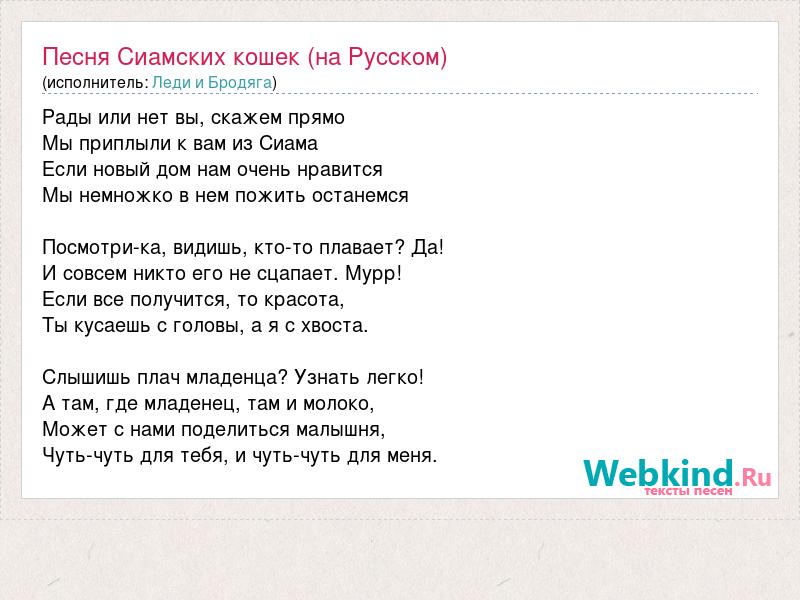 Рады или нет вы, скажем прямо Мы приплыли к вам из Сиама Если новый дом нам очень нравится Мы немножко в нем пожить останемся Посмотри-ка, видишь, кто-то плавает? Да! И совсем никто его не сцапает. Мурр! Если все получится, то красота, Ты кусаешь с головы, а я с хвоста. Слышишь плач младенца? Узнать легко! А там, где младенец, там и молоко, Может с нами поделиться малышня, Чуть-чуть для тебя, и чуть-чуть для меня.