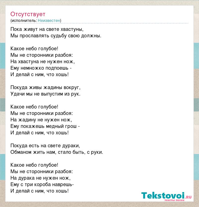 Пока живут на свете хвастуны, Мы прославлять судьбу свою должны. Какое небо голубое! Мы не сторонники разбоя: На хвастуна не нужен нож, Ему немножко подпоешь - И делай с ним, что хошь! Покуда живы жадины вокруг, Удачи мы не выпустим из рук. Какое небо голубое! Мы не сторонники разбоя: На жадину не нужен нож, Ему покажешь медный грош - И делай с ним, что хошь! Покуда есть на свете дураки, Обманом жить нам, стало быть, с руки. Какое небо голубое! Мы не сторонники разбоя: На дурака не нужен нож, Ему с три короба наврешь- И делай с ним, что хошь!