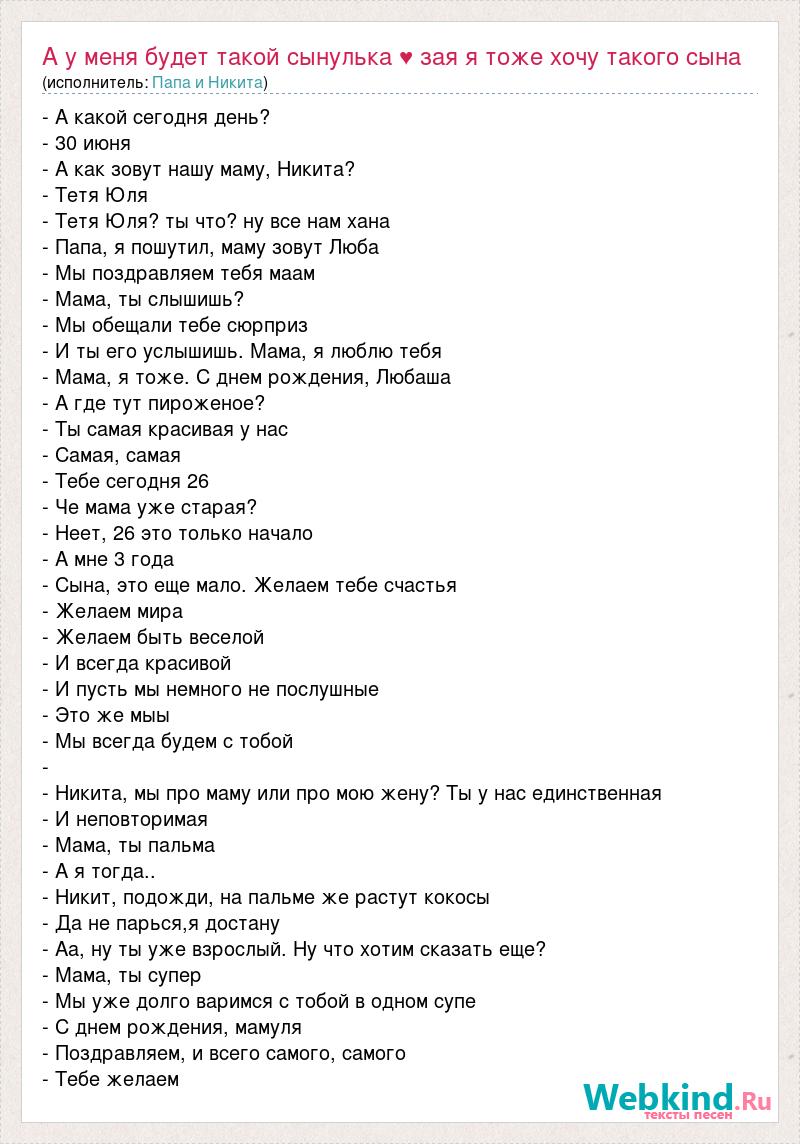 - А какой сегодня день? - 30 июня - А как зовут нашу маму, Никита? - Тетя Юля - Тетя Юля? ты что? ну все нам хана - Папа, я пошутил, маму зовут Люба - Мы поздравляем тебя маам - Мама, ты слышишь? - Мы обещали тебе сюрприз - И ты его услышишь. Мама, я люблю тебя - Мама, я тоже. С днем рождения, Любаша - А где тут пироженое? - Ты самая красивая у нас - Самая, самая - Тебе сегодня 26 - Че мама уже старая? - Неет, 26 это только начало - А мне 3 года - Сына, это еще мало. Желаем тебе счастья - Желаем мира - Желаем быть веселой - И всегда красивой - И пусть мы немного не послушные - Это же мыы - Мы всегда будем с тобой - - Никита, мы про маму или про мою жену? Ты у нас единственная - И неповторимая - Мама, ты пальма - А я тогда.. - Никит, подожди, на пальме же растут кокосы - Да не парься,я достану - Аа, ну ты уже взрослый. Ну что хотим сказать еще? - Мама, ты супер - Мы уже долго варимся с тобой в одном супе - С днем рождения, мамуля - Поздравляем, и всего самого, самого - Тебе желаем