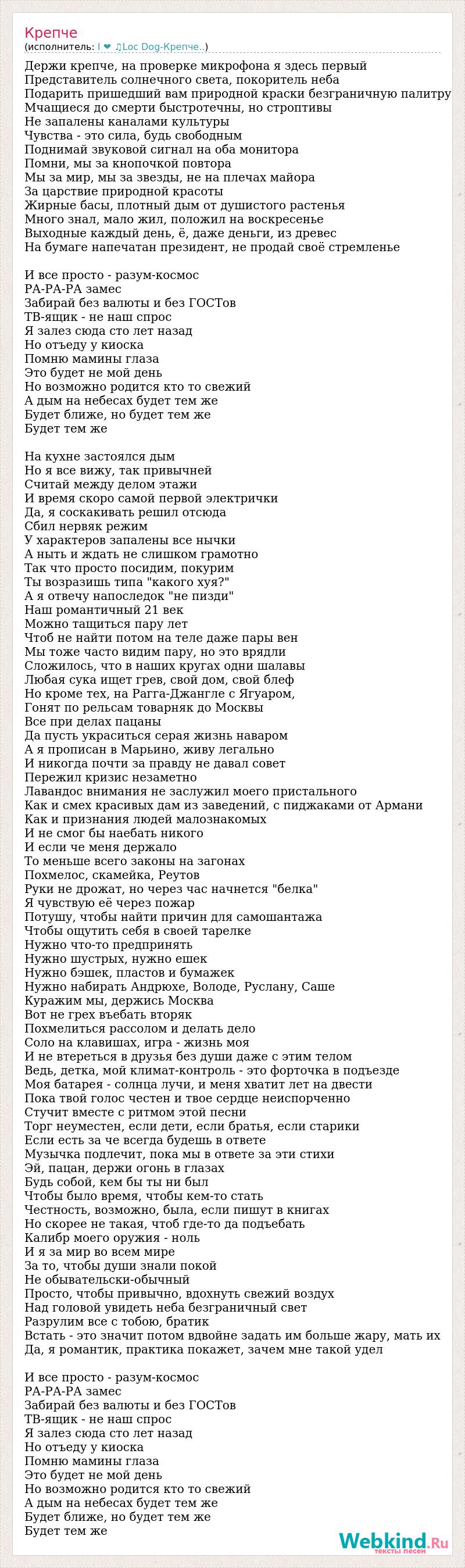 Держи крепче, на проверке микрофона я здесь первый Представитель солнечного света, покоритель неба Подарить пришедший вам природной краски безграничную палитру Мчащиеся до смерти быстротечны, но строптивы Не запалены каналами культуры Чувства - это сила, будь свободным Поднимай звуковой сигнал на оба монитора Помни, мы за кнопочкой повтора Мы за мир, мы за звезды, не на плечах майора За царствие природной красоты Жирные басы, плотный дым от душистого растенья Много знал, мало жил, положил на воскресенье Выходные каждый день, ё, даже деньги, из древес На бумаге напечатан президент, не продай своё стремленье И все просто - разум-космос РА-РА-РА замес Забирай без валюты и без ГОСТов ТВ-ящик - не наш спрос Я залез сюда сто лет назад Но отъеду у киоска Помню мамины глаза Это будет не мой день Но возможно родится кто то свежий А дым на небесах будет тем же Будет ближе, но будет тем же Будет тем же На кухне застоялся дым Но я все вижу, так привычней Считай между делом этажи И время скоро самой первой электрички Да, я соскакивать решил отсюда Сбил нервяк режим У характеров запалены все нычки А ныть и ждать не слишком грамотно Так что просто посидим, покурим Ты возразишь типа "какого хуя?" А я отвечу напоследок "не пизди" Наш романтичный 21 век Можно тащиться пару лет Чтоб не найти потом на теле даже пары вен Мы тоже часто видим пару, но это врядли Сложилось, что в наших кругах одни шалавы Любая сука ищет грев, свой дом, свой блеф Но кроме тех, на Рагга-Джангле с Ягуаром, Гонят по рельсам товарняк до Москвы Все при делах пацаны Да пусть украситься серая жизнь наваром А я прописан в Марьино, живу легально И никогда почти за правду не давал совет Пережил кризис незаметно Лавандос внимания не заслужил моего пристального Как и смех красивых дам из заведений, с пиджаками от Армани Как и признания людей малознакомых И не смог бы наебать никого И если че меня держало То меньше всего законы на загонах Похмелос, скамейка, Реутов Руки не дрожат, но через час начнется "белка" Я чувствую её через пожар Потушу, чтобы найти причин для самошантажа Чтобы ощутить себя в своей тарелке Нужно что-то предпринять Нужно шустрых, нужно ешек Нужно бэшек, пластов и бумажек Нужно набирать Андрюхе, Володе, Руслану, Саше Куражим мы, держись Москва Вот не грех въебать вторяк Похмелиться рассолом и делать дело Соло на клавишах, игра - жизнь моя И не втереться в друзья без души даже с этим телом Ведь, детка, мой климат-контроль - это форточка в подъезде Моя батарея - солнца лучи, и меня хватит лет на двести Пока твой голос честен и твое сердце неиспорченно Стучит вместе с ритмом этой песни Торг неуместен, если дети, если братья, если старики Если есть за че всегда будешь в ответе Музычка подлечит, пока мы в ответе за эти стихи Эй, пацан, держи огонь в глазах Будь собой, кем бы ты ни был Чтобы было время, чтобы кем-то стать Честность, возможно, была, если пишут в книгах Но скорее не такая, чтоб где-то да подъебать Калибр моего оружия - ноль И я за мир во всем мире За то, чтобы души знали покой Не обывательски-обычный Просто, чтобы привычно, вдохнуть свежий воздух Над головой увидеть неба безграничный свет Разрулим все с тобою, братик Встать - это значит потом вдвойне задать им больше жару, мать их Да, я романтик, практика покажет, зачем мне такой удел И все просто - разум-космос РА-РА-РА замес Забирай без ва