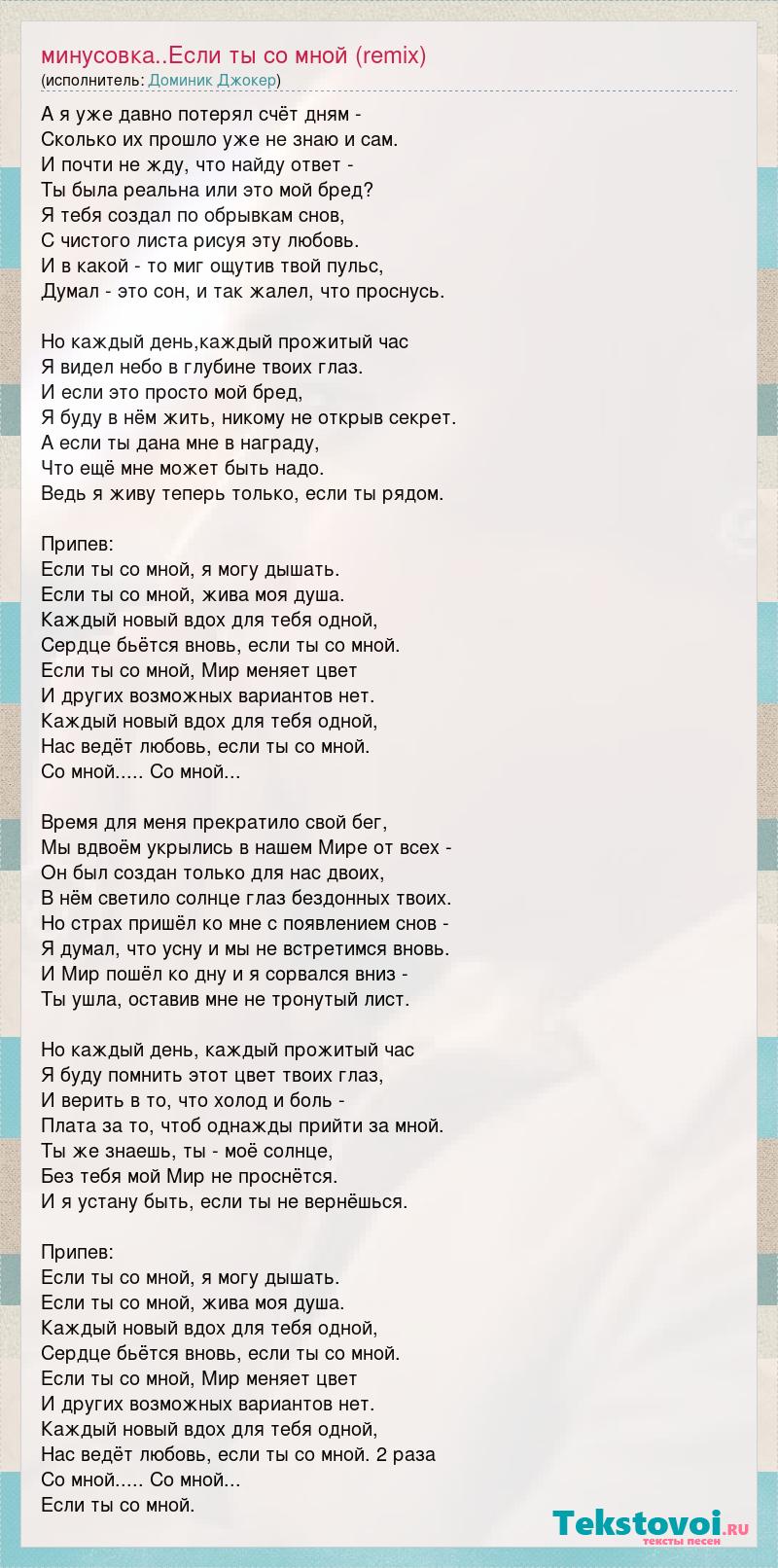 А я уже давно потерял счёт дням - Сколько их прошло уже не знаю и сам. И почти не жду, что найду ответ - Ты была реальна или это мой бред? Я тебя создал по обрывкам снов, С чистого листа рисуя эту любовь. И в какой - то миг ощутив твой пульс, Думал - это сон, и так жалел, что проснусь. Но каждый день,каждый прожитый час Я видел небо в глубине твоих глаз. И если это просто мой бред, Я буду в нём жить, никому не открыв секрет. А если ты дана мне в награду, Что ещё мне может быть надо. Ведь я живу теперь только, если ты рядом. Припев: Если ты со мной, я могу дышать. Если ты со мной, жива моя душа. Каждый новый вдох для тебя одной, Сердце бьётся вновь, если ты со мной. Если ты со мной, Мир меняет цвет И других возможных вариантов нет. Каждый новый вдох для тебя одной, Нас ведёт любовь, если ты со мной. Со мной..... Со мной... Время для меня прекратило свой бег, Мы вдвоём укрылись в нашем Мире от всех - Он был создан только для нас двоих, В нём светило солнце глаз бездонных твоих. Но страх пришёл ко мне с появлением снов - Я думал, что усну и мы не встретимся вновь. И Мир пошёл ко дну и я сорвался вниз - Ты ушла, оставив мне не тронутый лист. Но каждый день, каждый прожитый час Я буду помнить этот цвет твоих глаз, И верить в то, что холод и боль - Плата за то, чтоб однажды прийти за мной. Ты же знаешь, ты - моё солнце, Без тебя мой Мир не проснётся. И я устану быть, если ты не вернёшься. Припев: Если ты со мной, я могу дышать. Если ты со мной, жива моя душа. Каждый новый вдох для тебя одной, Сердце бьётся вновь, если ты со мной. Если ты со мной, Мир меняет цвет И других возможных вариантов нет. Каждый новый вдох для тебя одной, Нас ведёт любовь, если ты со мной. 2 раза Со мной..... Со мной... Если ты со мной.