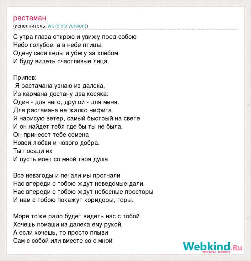 С утра глаза открою и увижу пред собою Небо голубое, а в небе птицы. Одену свои кеды и убегу за хлебом И буду видеть счастливые лица. Припев: Я растамана узнаю из далека, Из кармана достану два косяка: Один - для него, другой - для меня. Для растамана не жалко нифига. Я нарисую ветер, самый быстрый на свете И он найдет тебя где бы ты не была. Он принесет тебе семена Новой любви и нового добра. Ты посади их И пусть моет со мной твоя душа Все невзгоды и печали мы прогнали Нас впереди с тобою ждут неведомые дали. Нас впереди с тобою ждут небесные просторы И нам с тобою покажут коридоры, горы. Море тоже радо будет видеть нас с тобой Хочешь помаши из далека ему рукой. А если хочешь, то просто плыви Сам с собой или вместе со с мной