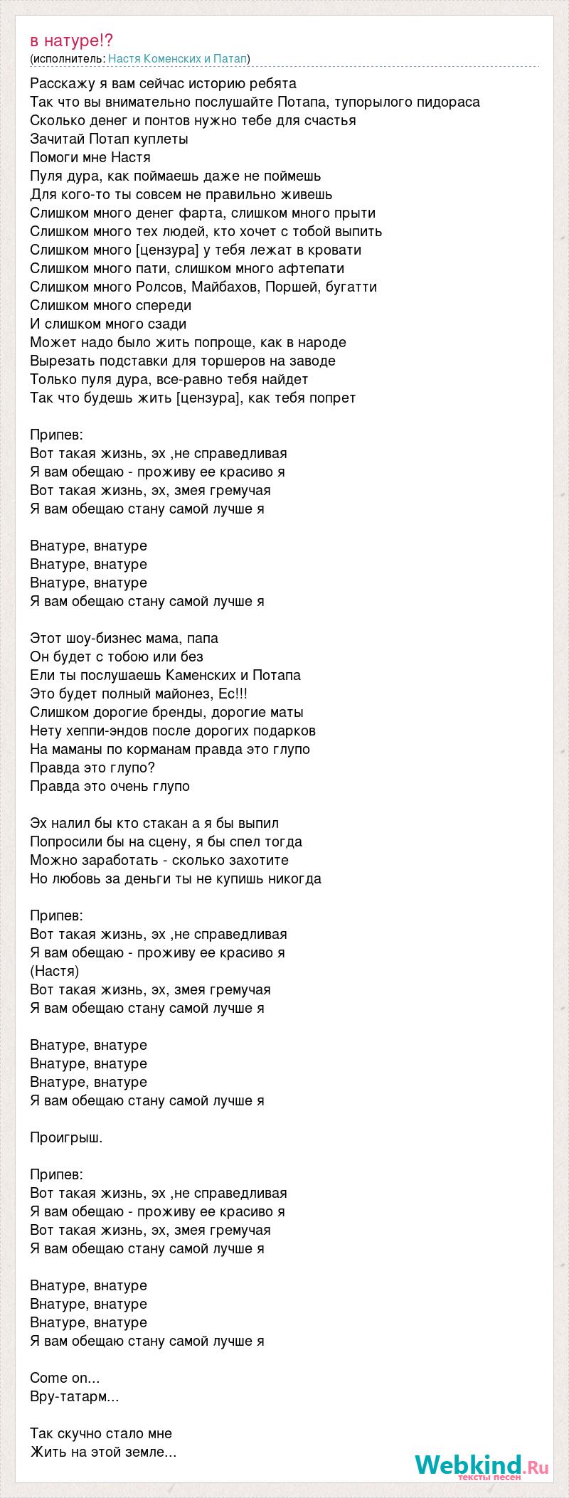 Расскажу я вам сейчас историю ребята Так что вы внимательно послушайте Потапа, тупорылого пидораса Сколько денег и понтов нужно тебе для счастья Зачитай Потап куплеты Помоги мне Настя Пуля дура, как поймаешь даже не поймешь Для кого-то ты совсем не правильно живешь Слишком много денег фарта, слишком много прыти Слишком много тех людей, кто хочет с тобой выпить Слишком много [цензура] у тебя лежат в кровати Слишком много пати, слишком много афтепати Слишком много Ролсов, Майбахов, Поршей, бугатти Слишком много спереди И слишком много сзади Может надо было жить попроще, как в народе Вырезать подставки для торшеров на заводе Только пуля дура, все-равно тебя найдет Так что будешь жить [цензура], как тебя попрет Припев: Вот такая жизнь, эх ,не справедливая Я вам обещаю - проживу ее красиво я Вот такая жизнь, эх, змея гремучая Я вам обещаю стану самой лучше я Внатуре, внатуре Внатуре, внатуре Внатуре, внатуре Я вам обещаю стану самой лучше я Этот шоу-бизнес мама, папа Он будет с тобою или без Ели ты послушаешь Каменских и Потапа Это будет полный майонез, Ес!!! Слишком дорогие бренды, дорогие маты Нету хеппи-эндов после дорогих подарков На маманы по корманам правда это глупо Правда это глупо? Правда это очень глупо Эх налил бы кто стакан а я бы выпил Попросили бы на сцену, я бы спел тогда Можно заработать - сколько захотите Но любовь за деньги ты не купишь никогда Припев: Вот такая жизнь, эх ,не справедливая Я вам обещаю - проживу ее красиво я (Настя) Вот такая жизнь, эх, змея гремучая Я вам обещаю стану самой лучше я Внатуре, внатуре Внатуре, внатуре Внатуре, внатуре Я вам обещаю стану самой лучше я Проигрыш. Припев: Вот такая жизнь, эх ,не справедливая Я вам обещаю - проживу ее красиво я Вот такая жизнь, эх, змея гремучая Я вам обещаю стану самой лучше я Внатуре, внатуре Внатуре, внатуре Внатуре, внатуре Я вам обещаю стану самой лучше я Come on... Вру-татарм... Так скучно стало мне Жить на этой земле...