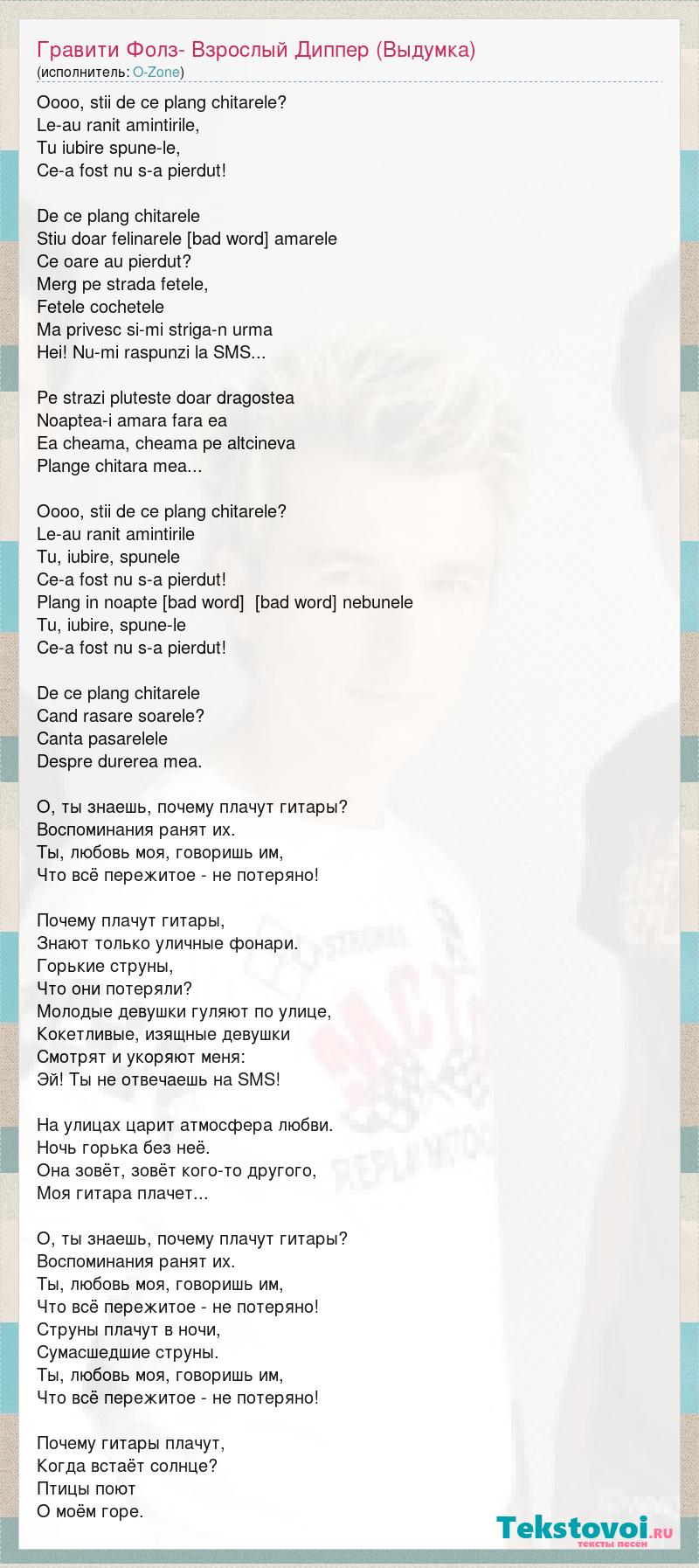 Oooo, stii de ce plang chitarele? Le-au ranit amintirile, Tu iubire spune-le, Ce-a fost nu s-a pierdut! De ce plang chitarele Stiu doar felinarele Strunele amarele Ce oare au pierdut? Merg pe strada fetele, Fetele cochetele Ma privesc si-mi striga-n urma Hei! Nu-mi raspunzi la SMS... Pe strazi pluteste doar dragostea Noaptea-i amara fara ea Ea cheama, cheama pe altcineva Plange chitara mea... Oooo, stii de ce plang chitarele? Le-au ranit amintirile Tu, iubire, spunele Ce-a fost nu s-a pierdut! Plang in noapte strunele, Strunele nebunele Tu, iubire, spune-le Ce-a fost nu s-a pierdut! De ce plang chitarele Cand rasare soarele? Canta pasarelele Despre durerea mea. О, ты знаешь, почему плачут гитары? Воспоминания ранят их. Ты, любовь моя, говоришь им, Что всё пережитое - не потеряно! Почему плачут гитары, Знают только уличные фонари. Горькие струны, Что они потеряли? Молодые девушки гуляют по улице, Кокетливые, изящные девушки Смотрят и укоряют меня: Эй! Ты не отвечаешь на SMS! На улицах царит атмосфера любви. Ночь горька без неё. Она зовёт, зовёт кого-то другого, Моя гитара плачет... О, ты знаешь, почему плачут гитары? Воспоминания ранят их. Ты, любовь моя, говоришь им, Что всё пережитое - не потеряно! Струны плачут в ночи, Сумасшедшие струны. Ты, любовь моя, говоришь им, Что всё пережитое - не потеряно! Почему гитары плачут, Когда встаёт солнце? Птицы поют О моём горе.