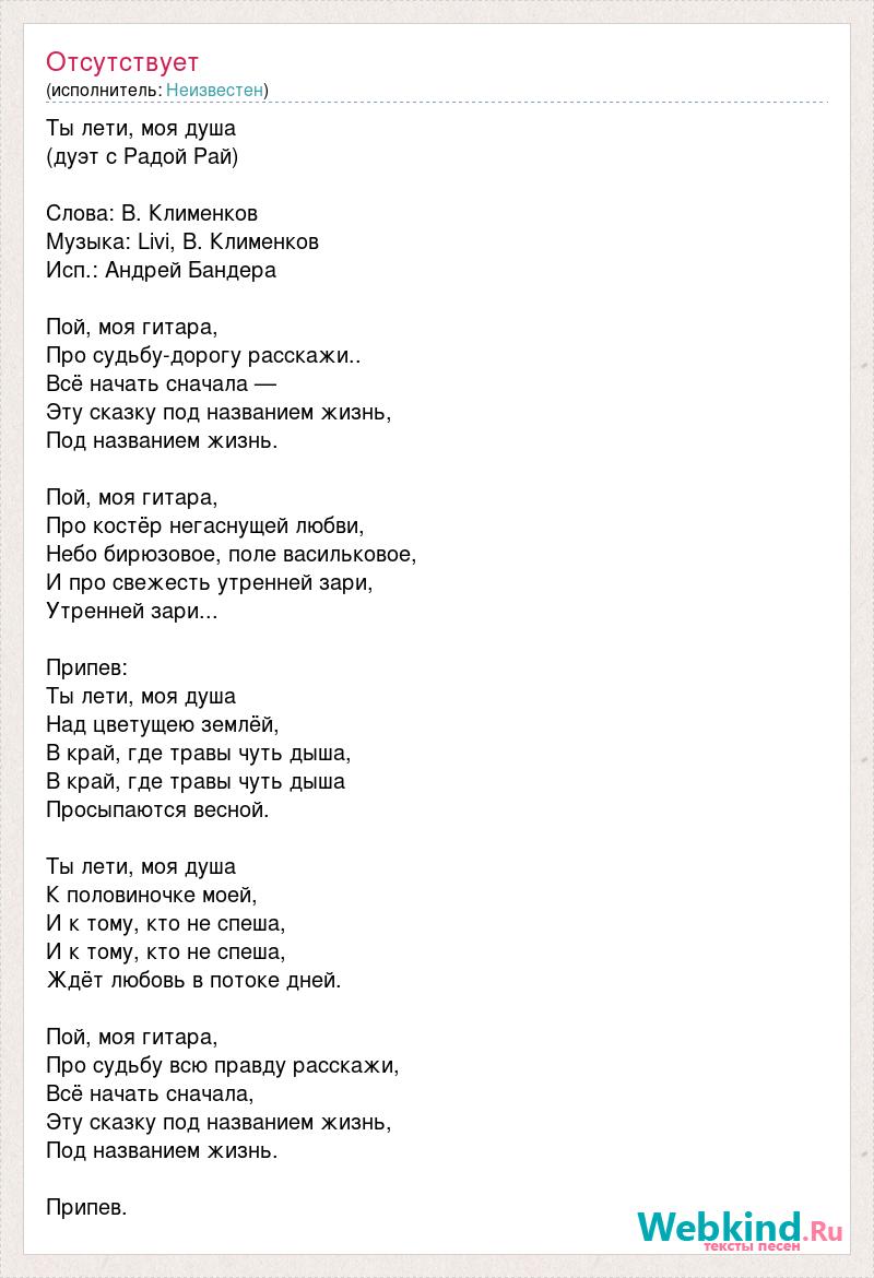 Ты лети, моя душа (дуэт с Радой Рай) Слова: В. Клименков Музыка: Livi, В. Клименков Исп.: Андрей Бандера Пой, моя гитара, Про судьбу-дорогу расскажи.. Всё начать сначала — Эту сказку под названием жизнь, Под названием жизнь. Пой, моя гитара, Про костёр негаснущей любви, Небо бирюзовое, поле васильковое, И про свежесть утренней зари, Утренней зари... Припев: Ты лети, моя душа Над цветущею землёй, В край, где травы чуть дыша, В край, где травы чуть дыша Просыпаются весной. Ты лети, моя душа К половиночке моей, И к тому, кто не спеша, И к тому, кто не спеша, Ждёт любовь в потоке дней. Пой, моя гитара, Про судьбу всю правду расскажи, Всё начать сначала, Эту сказку под названием жизнь, Под названием жизнь. Припев.