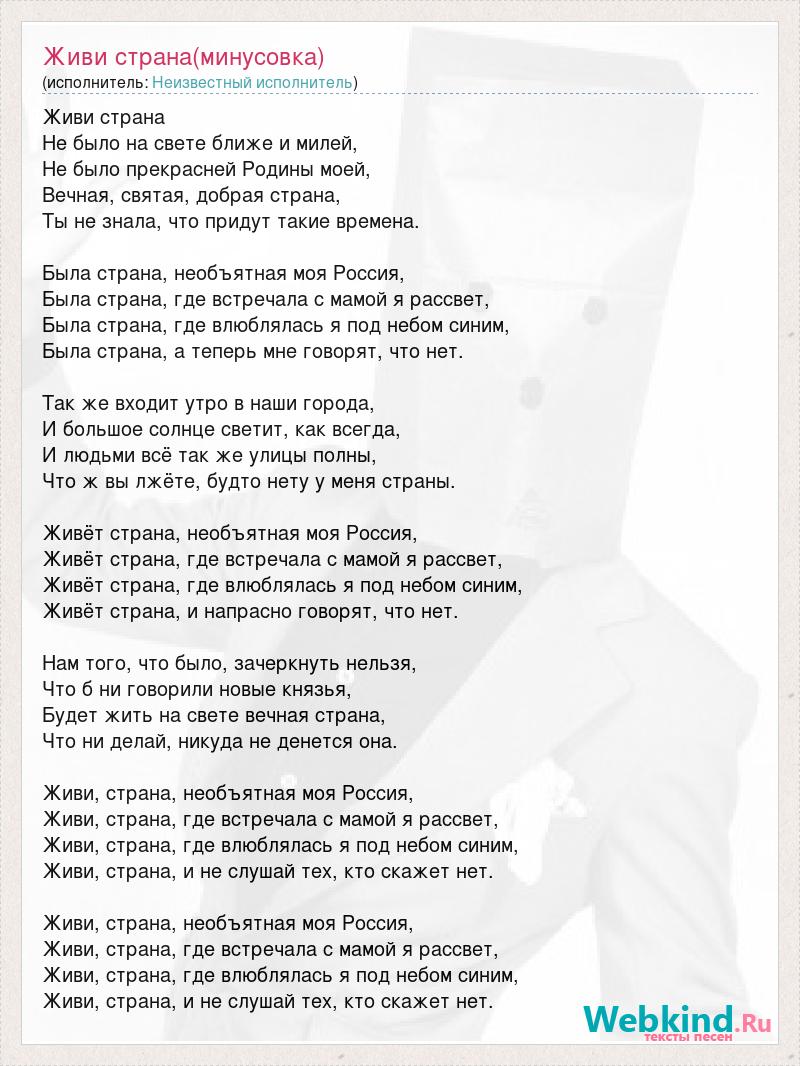 Живи страна Не было на свете ближе и милей, Не было прекрасней Родины моей, Вечная, святая, добрая страна, Ты не знала, что придут такие времена. Была страна, необъятная моя Россия, Была страна, где встречала с мамой я рассвет, Была страна, где влюблялась я под небом синим, Была страна, а теперь мне говорят, что нет. Так же входит утро в наши города, И большое солнце светит, как всегда, И людьми всё так же улицы полны, Что ж вы лжёте, будто нету у меня страны. Живёт страна, необъятная моя Россия, Живёт страна, где встречала с мамой я рассвет, Живёт страна, где влюблялась я под небом синим, Живёт страна, и напрасно говорят, что нет. Нам того, что было, зачеркнуть нельзя, Что б ни говорили новые князья, Будет жить на свете вечная страна, Что ни делай, никуда не денется она. Живи, страна, необъятная моя Россия, Живи, страна, где встречала с мамой я рассвет, Живи, страна, где влюблялась я под небом синим, Живи, страна, и не слушай тех, кто скажет нет. Живи, страна, необъятная моя Россия, Живи, страна, где встречала с мамой я рассвет, Живи, страна, где влюблялась я под небом синим, Живи, страна, и не слушай тех, кто скажет нет.