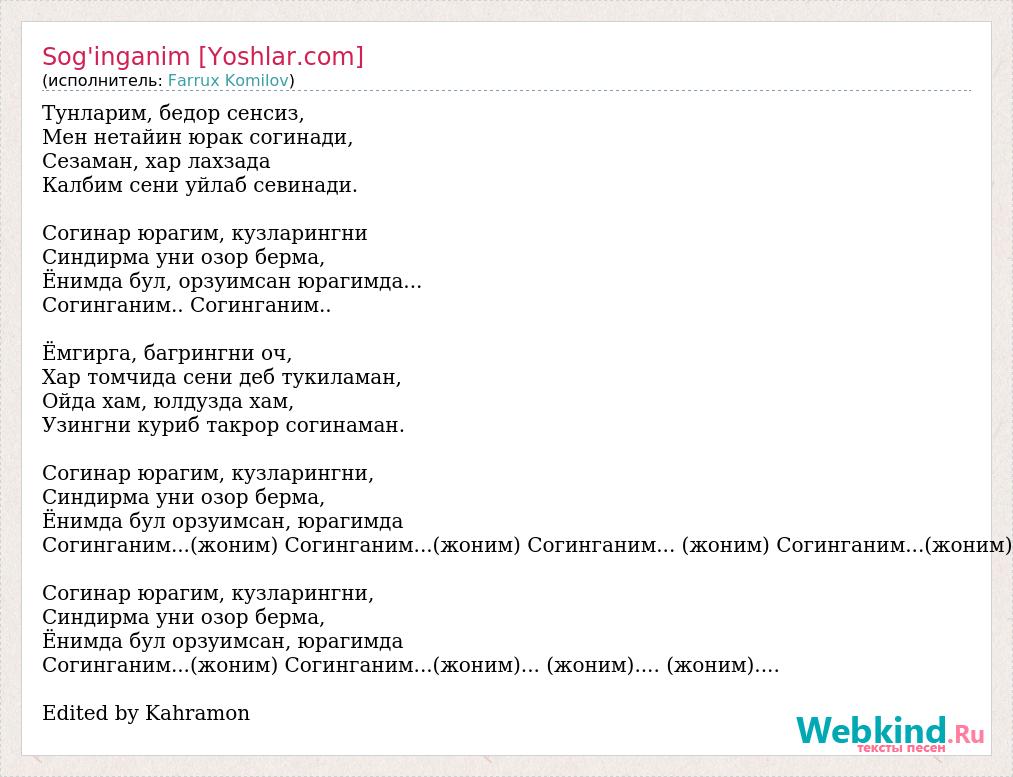 Тунларим, бедор сенсиз, Мен нетайин юрак согинади, Сезаман, хар лахзада Калбим сени уйлаб севинади. Согинар юрагим, кузларингни Синдирма уни озор берма, Ёнимда бул, орзуимсан юрагимда... Согинганим.. Согинганим.. Ёмгирга, багрингни оч, Хар томчида сени деб тукиламан, Ойда хам, юлдузда хам, Узингни куриб такрор согинаман. Согинар юрагим, кузларингни, Синдирма уни озор берма, Ёнимда бул орзуимсан, юрагимда Согинганим...(жоним) Согинганим...(жоним) Согинганим... (жоним) Согинганим...(жоним) Согинар юрагим, кузларингни, Синдирма уни озор берма, Ёнимда бул орзуимсан, юрагимда Согинганим...(жоним) Согинганим...(жоним)... (жоним).... (жоним).... Edited by Kahramon