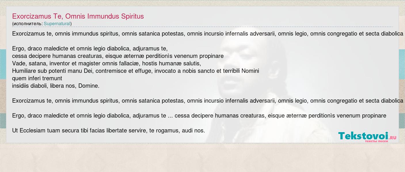 Exorcizamus te, omnis immundus spiritus, omnis satanica potestas, omnis incursio infernalis adversarii, omnis legio, omnis congregatio et secta diabolica Ergo, draco maledicte et omnis legio diabolica, adjuramus te, cessa decipere humanas creaturas, eisque æternæ perditionìs venenum propinare Vade, satana, inventor et magister omnis fallaciæ, hostis humanæ salutis, Humiliare sub potenti manu Dei, contremisce et effuge, invocato a nobis sancto et terribili Nomini quem inferi tremunt insidiis diaboli, libera nos, Domine. Exorcizamus te, omnis immundus spiritus, omnis satanica potestas, omnis incursio infernalis adversarii, omnis legio, omnis congregatio et secta diabolica Ergo, draco maledicte et omnis legio diabolica, adjuramus te ... cessa decipere humanas creaturas, eisque æternæ perditionìs venenum propinare Ut Ecclesiam tuam secura tibi facias libertate servire, te rogamus, audi nos.