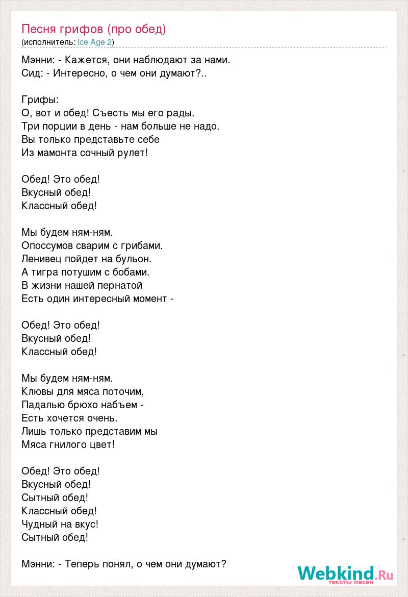 Мэнни: - Кажется, они наблюдают за нами. Сид: - Интересно, о чем они думают?.. Грифы: О, вот и обед! Съесть мы его рады. Три порции в день - нам больше не надо. Вы только представьте себе Из мамонта сочный рулет! Обед! Это обед! Вкусный обед! Классный обед! Мы будем ням-ням. Опоссумов сварим с грибами. Ленивец пойдет на бульон. А тигра потушим с бобами. В жизни нашей пернатой Есть один интересный момент - Обед! Это обед! Вкусный обед! Классный обед! Мы будем ням-ням. Клювы для мяса поточим, Падалью брюхо набъем - Есть хочется очень. Лишь только представим мы Мяса гнилого цвет! Обед! Это обед! Вкусный обед! Сытный обед! Классный обед! Чудный на вкус! Сытный обед! Мэнни: - Теперь понял, о чем они думают?