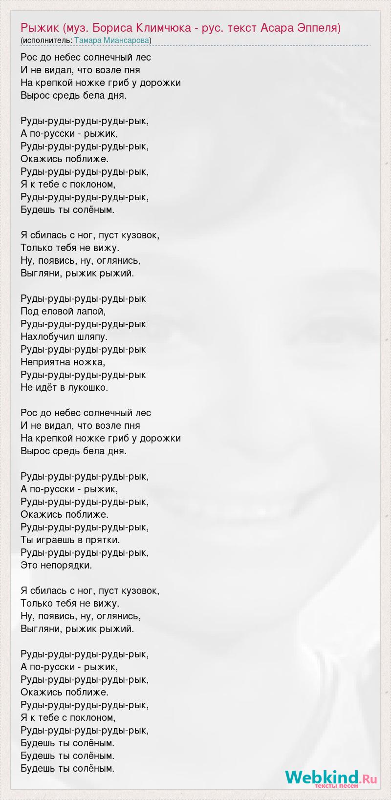 Рос до небес солнечный лес И не видал, что возле пня На крепкой ножке гриб у дорожки Вырос средь бела дня. Руды-руды-руды-руды-рык, А по-русски - рыжик, Руды-руды-руды-руды-рык, Окажись поближе. Руды-руды-руды-руды-рык, Я к тебе с поклоном, Руды-руды-руды-руды-рык, Будешь ты солёным. Я сбилась с ног, пуст кузовок, Только тебя не вижу. Ну, появись, ну, оглянись, Выгляни, рыжик рыжий. Руды-руды-руды-руды-рык Под еловой лапой, Руды-руды-руды-руды-рык Нахлобучил шляпу. Руды-руды-руды-руды-рык Неприятна ножка, Руды-руды-руды-руды-рык Не идёт в лукошко. Рос до небес солнечный лес И не видал, что возле пня На крепкой ножке гриб у дорожки Вырос средь бела дня. Руды-руды-руды-руды-рык, А по-русски - рыжик, Руды-руды-руды-руды-рык, Окажись поближе. Руды-руды-руды-руды-рык, Ты играешь в прятки. Руды-руды-руды-руды-рык, Это непорядки. Я сбилась с ног, пуст кузовок, Только тебя не вижу. Ну, появись, ну, оглянись, Выгляни, рыжик рыжий. Руды-руды-руды-руды-рык, А по-русски - рыжик, Руды-руды-руды-руды-рык, Окажись поближе. Руды-руды-руды-руды-рык, Я к тебе с поклоном, Руды-руды-руды-руды-рык, Будешь ты солёным. Будешь ты солёным. Будешь ты солёным.