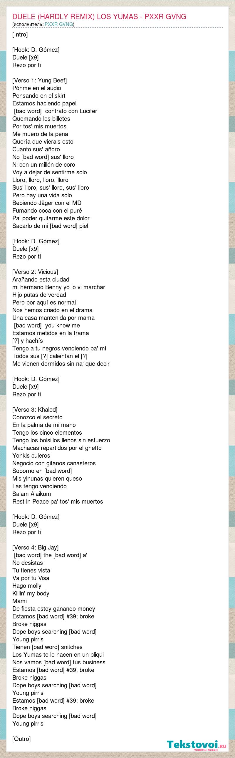 [Intro] [Hook: D. Gómez] Duele [x9] Rezo por ti [Verso 1: Yung Beef] Pónme en el audio Pensando en el skirt Estamos haciendo papel [bad word] contrato con Lucifer Quemando los billetes Por tos' mis muertos Me muero de la pena Quería que vierais esto Cuanto sus' añoro No [bad word] sus' lloro Ni con un millón de coro Voy a dejar de sentirme solo Lloro, lloro, lloro, lloro Sus' lloro, sus' lloro, sus' lloro Pero hay una vida solo Bebiendo Jäger con el MD Fumando coca con el puré Pa' poder quitarme este dolor Sacarlo de mi [bad word] piel [Hook: D. Gómez] Duele [x9] Rezo por ti [Verso 2: Vicious] Arañando esta ciudad mi hermano Benny yo lo vi marchar Hijo putas de verdad Pero por aquí es normal Nos hemos criado en el drama Una casa mantenida por mama [bad word] you know me Estamos metidos en la trama [?] y hachís Tengo a tu negros vendiendo pa' mi Todos sus [?] calientan el [?] Me vienen dormidos sin na' que decir [Hook: D. Gómez] Duele [x9] Rezo por ti [Verso 3: Khaled] Conozco el secreto En la palma de mi mano Tengo los cinco elementos Tengo los bolsillos llenos sin esfuerzo Machacas repartidos por el ghetto Yonkis culeros Negocio con gitanos canasteros Soborno en [bad word] Mis yinunas quieren queso Las tengo vendiendo Salam Alaikum Rest in Peace pa' tos' mis muertos [Hook: D. Gómez] Duele [x9] Rezo por ti [Verso 4: Big Jay] [bad word] the [bad word] a' No desistas Tu tienes vista Va por tu Visa Hago molly Killin' my body Mami De fiesta estoy ganando money Estamos [bad word] #39; broke Broke niggas Dope boys searching [bad word] Young pirris Tienen [bad word] snitches Los Yumas te lo hacen en un pliqui Nos vamos [bad word] tus business Estamos [bad word] #39; broke Broke niggas Dope boys searching [bad word] Young pirris Estamos [bad word] #39; broke Broke niggas Dope boys searching [bad word] Young pirris [Outro]