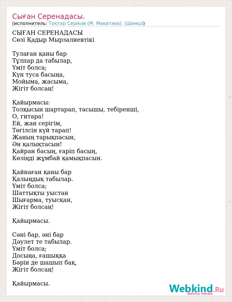 СЫҒАН СЕРЕНАДАСЫ Сөзі Қадыр Мырзалиевтікі Тулаған қаны бар Тұлпар да табылар, Үміт болса; Күн туса басыңа, Мойыма, жасыма, Жігіт болсаң! Қайырмасы: Толқысын шартарап, тасышы, тебіренші, О, гитара! Ей, жан серігім, Төгілсін күй тарап! Жаның тарықпасын, Ән қалықтасын! Қайран басың, ғаріп басың, Көзіңді жұмбай қамықпасын. Қайнаған қаны бар Қалыңдық табылар. Үміт болса; Шаттықты уыстан Шығарма, туысқан, Жігіт болсаң! Қайырмасы. Сәні бар, әні бар Дәулет те табылар. Үміт болса; Досыңа, ғашыққа Бәрін де шашып бақ, Жігіт болсаң! Қайырмасы.