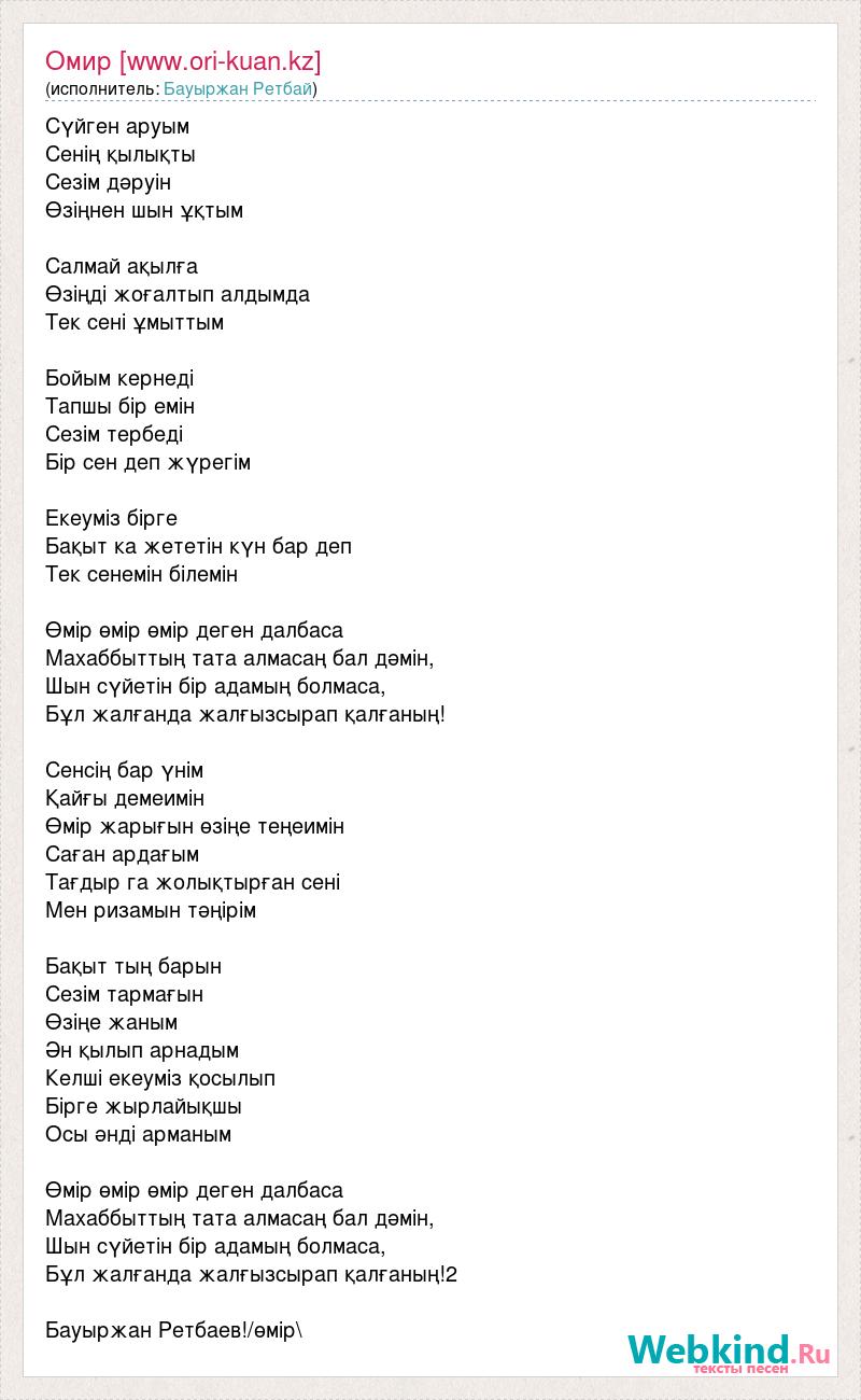 Сүйген аруым Сенің қылықты Сезім дәруін Өзіңнен шын ұқтым Салмай ақылға Өзіңді жоғалтып алдымда Тек сені ұмыттым Бойым кернеді Тапшы бір емін Сезім тербеді Бір сен деп жүрегім Екеуміз бірге Бақыт ка жететін күн бар деп Тек сенемін білемін Өмiр өмiр өмiр деген далбаса Махаббыттың тата алмасаң бал дәмiн, Шын сүйетiн бiр адамың болмаса, Бұл жалғанда жалғызсырап қалғаның! Сенсің бар үнім Қайғы демеимін Өмір жарығын өзіңе теңеимін Саған ардағым Тағдыр га жолықтырған сені Мен ризамын тәңірім Бақыт тың барын Сезім тармағын Өзіңе жаным Ән қылып арнадым Келші екеуміз қосылып Бірге жырлайықшы Осы әнді арманым Өмiр өмiр өмiр деген далбаса Махаббыттың тата алмасаң бал дәмiн, Шын сүйетiн бiр адамың болмаса, Бұл жалғанда жалғызсырап қалғаның!2 Бауыржан Ретбаев!/өмір\