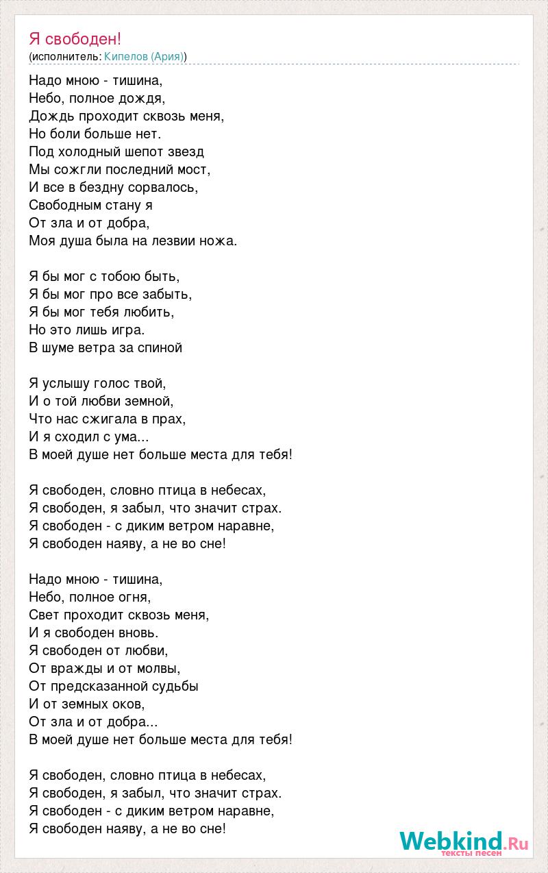 Надо мною - тишина, Небо, полное дождя, Дождь проходит сквозь меня, Но боли больше нет. Под холодный шепот звезд Мы сожгли последний мост, И все в бездну сорвалось, Свободным стану я От зла и от добра, Моя душа была на лезвии ножа. Я бы мог с тобою быть, Я бы мог про все забыть, Я бы мог тебя любить, Но это лишь игра. В шуме ветра за спиной Я услышу голос твой, И о той любви земной, Что нас сжигала в прах, И я сходил с ума... В моей душе нет больше места для тебя! Я свободен, словно птица в небесах, Я свободен, я забыл, что значит страх. Я свободен - с диким ветром наравне, Я свободен наяву, а не во сне! Надо мною - тишина, Небо, полное огня, Свет проходит сквозь меня, И я свободен вновь. Я свободен от любви, От вражды и от молвы, От предсказанной судьбы И от земных оков, От зла и от добра... В моей душе нет больше места для тебя! Я свободен, словно птица в небесах, Я свободен, я забыл, что значит страх. Я свободен - с диким ветром наравне, Я свободен наяву, а не во сне!