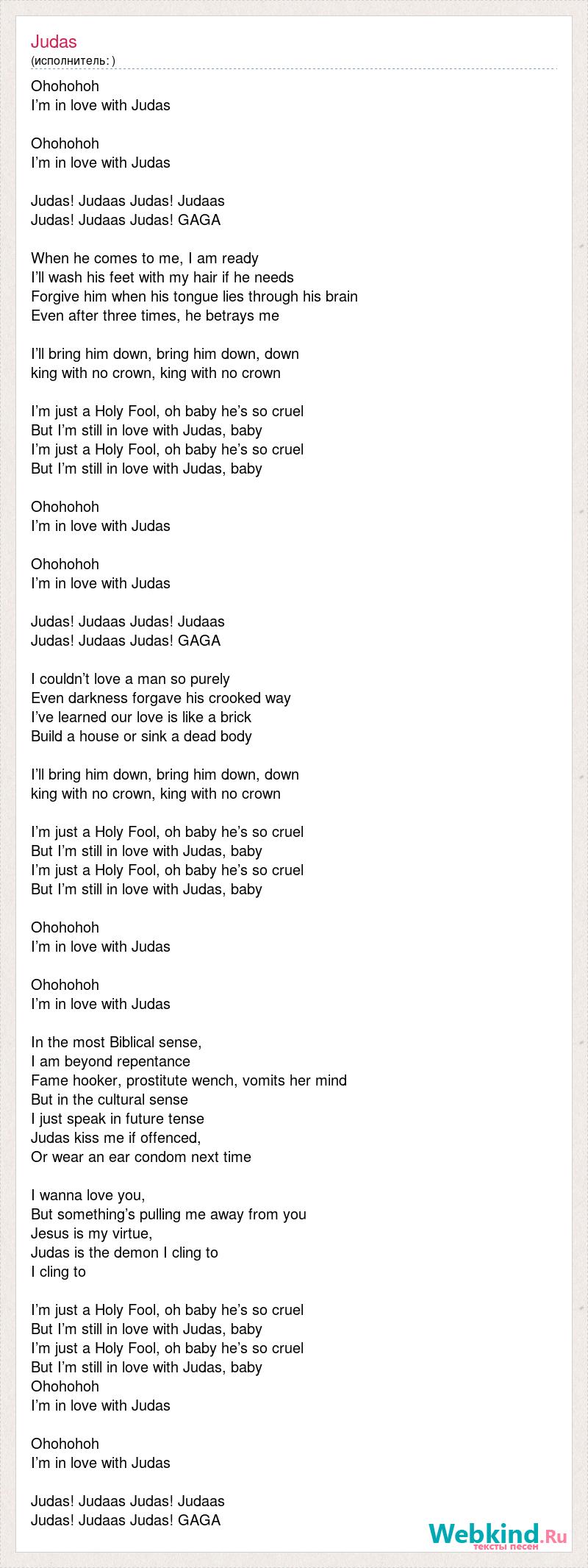 Ohohohoh I’m in love with Judas Ohohohoh I’m in love with Judas Judas! Judaas Judas! Judaas Judas! Judaas Judas! GAGA When he comes to me, I am ready I’ll wash his feet with my hair if he needs Forgive him when his tongue lies through his brain Even after three times, he betrays me I’ll bring him down, bring him down, down king with no crown, king with no crown I’m just a Holy Fool, oh baby he’s so cruel But I’m still in love with Judas, baby I’m just a Holy Fool, oh baby he’s so cruel But I’m still in love with Judas, baby Ohohohoh I’m in love with Judas Ohohohoh I’m in love with Judas Judas! Judaas Judas! Judaas Judas! Judaas Judas! GAGA I couldn’t love a man so purely Even darkness forgave his crooked way I’ve learned our love is like a brick Build a house or sink a dead body I’ll bring him down, bring him down, down king with no crown, king with no crown I’m just a Holy Fool, oh baby he’s so cruel But I’m still in love with Judas, baby I’m just a Holy Fool, oh baby he’s so cruel But I’m still in love with Judas, baby Ohohohoh I’m in love with Judas Ohohohoh I’m in love with Judas In the most Biblical sense, I am beyond repentance Fame hooker, prostitute wench, vomits her mind But in the cultural sense I just speak in future tense Judas kiss me if offenced, Or wear an ear condom next time I wanna love you, But something’s pulling me away from you Jesus is my virtue, Judas is the demon I cling to I cling to I’m just a Holy Fool, oh baby he’s so cruel But I’m still in love with Judas, baby I’m just a Holy Fool, oh baby he’s so cruel But I’m still in love with Judas, baby Ohohohoh I’m in love with Judas Ohohohoh I’m in love with Judas Judas! Judaas Judas! Judaas Judas! Judaas Judas! GAGA