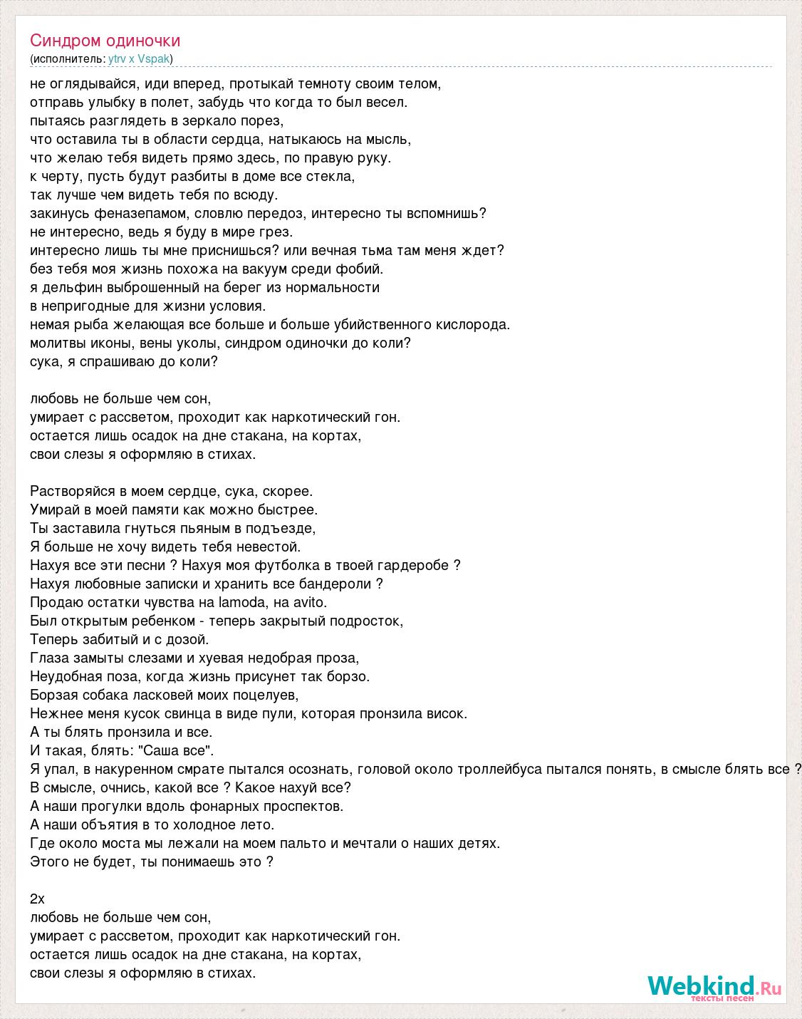 не оглядывайся, иди вперед, протыкай темноту своим телом, отправь улыбку в полет, забудь что когда то был весел. пытаясь разглядеть в зеркало порез, что оставила ты в области сердца, натыкаюсь на мысль, что желаю тебя видеть прямо здесь, по правую руку. к черту, пусть будут разбиты в доме все стекла, так лучше чем видеть тебя по всюду. закинусь феназепамом, словлю передоз, интересно ты вспомнишь? не интересно, ведь я буду в мире грез. интересно лишь ты мне приснишься? или вечная тьма там меня ждет? без тебя моя жизнь похожа на вакуум среди фобий. я дельфин выброшенный на берег из нормальности в непригодные для жизни условия. немая рыба желающая все больше и больше убийственного кислорода. молитвы иконы, вены уколы, синдром одиночки до коли? сука, я спрашиваю до коли? любовь не больше чем сон, умирает с рассветом, проходит как наркотический гон. остается лишь осадок на дне стакана, на кортах, свои слезы я оформляю в стихах. Растворяйся в моем сердце, сука, скорее. Умирай в моей памяти как можно быстрее. Ты заставила гнуться пьяным в подъезде, Я больше не хочу видеть тебя невестой. Нахуя все эти песни ? Нахуя моя футболка в твоей гардеробе ? Нахуя любовные записки и хранить все бандероли ? Продаю остатки чувства на lamoda, на avito. Был открытым ребенком - теперь закрытый подросток, Теперь забитый и с дозой. Глаза замыты слезами и хуевая недобрая проза, Неудобная поза, когда жизнь присунет так борзо. Борзая собака ласковей моих поцелуев, Нежнее меня кусок свинца в виде пули, которая пронзила висок. А ты блять пронзила и все. И такая, блять: "Саша все". Я упал, в накуренном смрате пытался осознать, головой около троллейбуса пытался понять, в смысле блять все ? В смысле, очнись, какой все ? Какое нахуй все? А наши прогулки вдоль фонарных проспектов. А наши объятия в то холодное лето. Где около моста мы лежали на моем пальто и мечтали о наших детях. Этого не будет, ты понимаешь это ? 2x любовь не больше чем сон, умирает с рассветом, проходит как наркотический гон. остается лишь осадок на дне стакана, на кортах, свои слезы я оформляю в стихах.