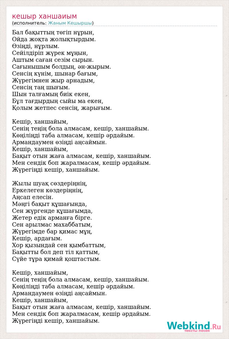 Бал бақыттың төгіп нұрын, Ойда жоқта жолықтырдым. Өзіңді, нұрлым. Сейілдіріп жүрек мұңын, Аштым саған сезім сырын. Сағынышым болдың, ән-жырым. Сенсің күнім, шынар бағым, Жүрегімнен жыр арнадым, Сенсің таң шығым. Шын талғамың биік екен, Бұл тағдырдың сыйы ма екен, Қолым жетпес сенсің, жарығым. Кешір, ханшайым, Сенің теңің бола алмасам, кешір, ханшайым. Көңіліңді таба алмасам, кешір әрдайым. Армандаумен өзіңді аңсаймын. Кешір, ханшайым, Бақыт отын жаға алмасам, кешір, ханшайым. Мен сендік боп жаралмасам, кешір әрдайым. Жүрегіңді кешір, ханшайым. Жылы шуақ сөздеріңнің, Еркелеген көздеріңнің, Аңсап елесін. Мәңгі бақыт құшағында, Сен жүргенде құшағымда, Жетер едік арманға бірге. Сен арылмас махаббатым, Жүрегімде бар қимас мұң, Кешір, ардағым. Хор қызындай сен қымбаттым, Бақытты бол деп тіл қаттым, Сүйе тұра қимай қоштастым. Кешір, ханшайым, Сенің теңің бола алмасам, кешір, ханшайым. Көңіліңді таба алмасам, кешір әрдайым. Армандаумен өзіңді аңсаймын. Кешір, ханшайым, Бақыт отын жаға алмасам, кешір, ханшайым. Мен сендік боп жаралмасам, кешір әрдайым. Жүрегіңді кешір, ханшайым.