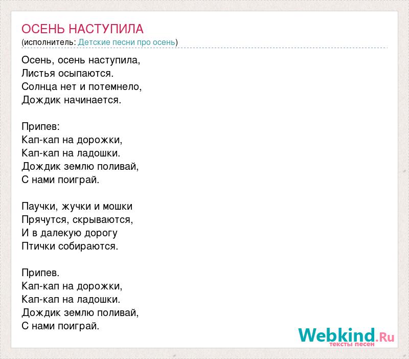 Осень, осень наступила, Листья осыпаются. Солнца нет и потемнело, Дождик начинается. Припев: Кап-кап на дорожки, Кап-кап на ладошки. Дождик землю поливай, С нами поиграй. Паучки, жучки и мошки Прячутся, скрываются, И в далекую дорогу Птички собираются. Припев. Кап-кап на дорожки, Кап-кап на ладошки. Дождик землю поливай, С нами поиграй.