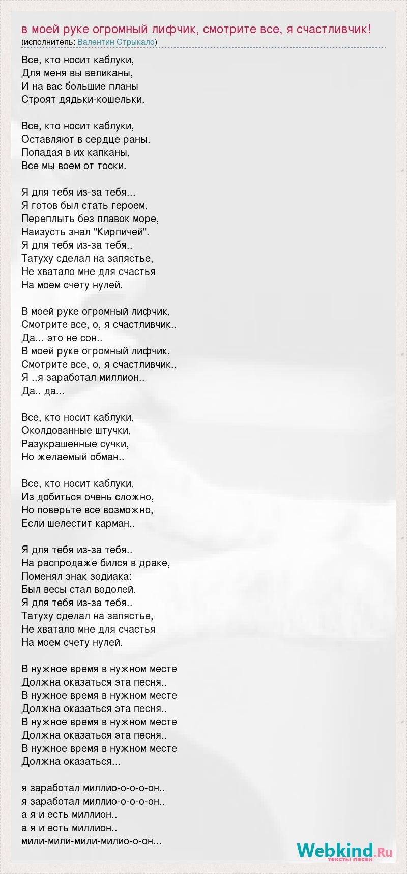 Все, кто носит каблуки, Для меня вы великаны, И на вас большие планы Строят дядьки-кошельки. Все, кто носит каблуки, Оставляют в сердце раны. Попадая в их капканы, Все мы воем от тоски. Я для тебя из-за тебя... Я готов был стать героем, Переплыть без плавок море, Наизусть знал "Кирпичей". Я для тебя из-за тебя.. Татуху сделал на запястье, Не хватало мне для счастья На моем счету нулей. В моей руке огромный лифчик, Смотрите все, о, я счастливчик.. Да... это не сон.. В моей руке огромный лифчик, Смотрите все, о, я счастливчик.. Я ..я заработал миллион.. Да.. да... Все, кто носит каблуки, Околдованные штучки, Разукрашенные сучки, Но желаемый обман.. Все, кто носит каблуки, Из добиться очень сложно, Но поверьте все возможно, Если шелестит карман.. Я для тебя из-за тебя.. На распродаже бился в драке, Поменял знак зодиака: Был весы стал водолей. Я для тебя из-за тебя.. Татуху сделал на запястье, Не хватало мне для счастья На моем счету нулей. В нужное время в нужном месте Должна оказаться эта песня.. В нужное время в нужном месте Должна оказаться эта песня.. В нужное время в нужном месте Должна оказаться эта песня.. В нужное время в нужном месте Должна оказаться... я заработал миллио-о-о-о-он.. я заработал миллио-о-о-о-он.. а я и есть миллион.. а я и есть миллион.. мили-мили-мили-милио-о-он...