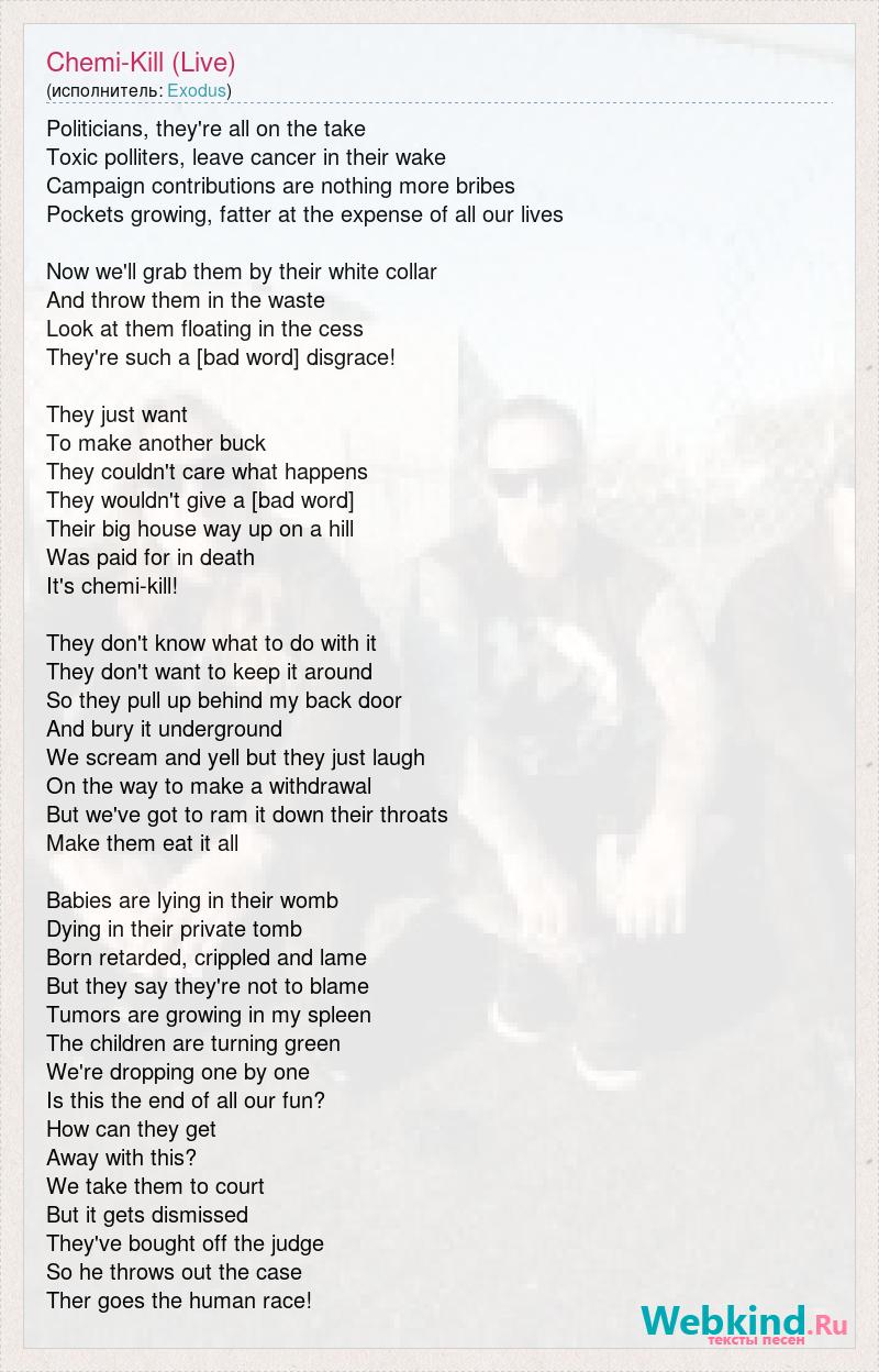 Politicians, they're all on the take Toxic polliters, leave cancer in their wake Campaign contributions are nothing more bribes Pockets growing, fatter at the expense of all our lives Now we'll grab them by their white collar And throw them in the waste Look at them floating in the cess They're such a [bad word] disgrace! They just want To make another buck They couldn't care what happens They wouldn't give a [bad word] Their big house way up on a hill Was paid for in death It's chemi-kill! They don't know what to do with it They don't want to keep it around So they pull up behind my back door And bury it underground We scream and yell but they just laugh On the way to make a withdrawal But we've got to ram it down their throats Make them eat it all Babies are lying in their womb Dying in their private tomb Born retarded, crippled and lame But they say they're not to blame Tumors are growing in my spleen The children are turning green We're dropping one by one Is this the end of all our fun? How can they get Away with this? We take them to court But it gets dismissed They've bought off the judge So he throws out the case Ther goes the human race!