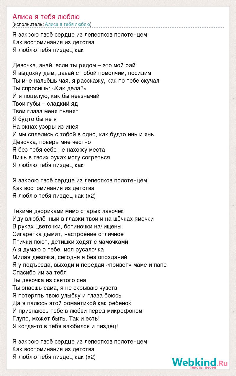 Я закрою твоё сердце из лепестков полотенцем Как воспоминания из детства Я люблю тебя пиздец как Девочка, знай, если ты рядом – это мой рай Я выдохну дым, давай с тобой помолчим, посидим Ты мне нальёшь чая, я расскажу, как по тебе скучал Ты спросишь: «Как дела?» И я поцелую, как бы невзначай Твои губы – сладкий яд Твои глаза меня пьянят Я будто бы не я На окнах узоры из инея И мы сплелись с тобой в одно, как будто инь и янь Девочка, поверь мне честно Я без тебя себе не нахожу места Лишь в твоих руках могу согреться Я люблю тебя пиздец как Я закрою твоё сердце из лепестков полотенцем Как воспоминания из детства Я люблю тебя пиздец как (х2) Тихими двориками мимо старых лавочек Иду влюблённый в глазки твои и на щёчках ямочки В руках цветочки, ботиночки начищены Сигаретка дымит, настроение отличное Птички поют, детишки ходят с мамочками А я думаю о тебе, моя русалочка Милая девочка, сегодня я без опозданий Я у подъезда, выходи и передай «привет» маме и папе Спасибо им за тебя Ты девочка из святого сна Ты знаешь сама, я не скрываю чувств Я потерять твою улыбку и глаза боюсь Да я палюсь этой романтикой как ребёнок И признаюсь тебе в любви перед микрофоном Глупо, может быть. Так и есть! Я когда-то в тебя влюбился и пиздец! Я закрою твоё сердце из лепестков полотенцем Как воспоминания из детства Я люблю тебя пиздец как (х2)