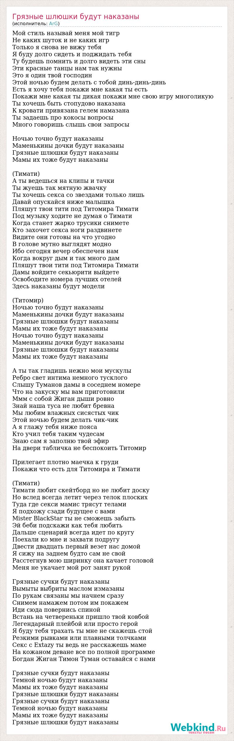 Мой стиль называй меня мой тигр Не каких шуток и не каких игр Только я снова не вижу тебя Я буду долго сидеть и поджидать тебя Ту будешь помнить и долго видеть эти сны Эти красные танцы нам так нужны Это я один твой господин Этой ночью будем делать с тобой динь-динь-динь Есть я хочу тебя покажи мне какая ты есть Покажи мне какая ты дикая покажи мне свою игру многоликую Ты хочешь быть стопудово наказана К кровати привязана гелем намазана Ты задаешь про кокосы вопросы Много говоришь слышь свои запросы Ночью точно будут наказаны Маменькины дочки будут наказаны Грязные шлюшки будут наказаны Мамы их тоже будут наказаны (Тимати) А ты ведешься на клипы и тачки Ты жуешь так мятную жвачку Ты хочешь секса со звездами только лишь Давай опускайся ниже малышка Пляшут твои тити под Титомира Тимати Под музыку ходите не думая о Тимати Когда станет жарко трусики снимете Кто захочет секса ноги раздвинете Видите они готовы на что угодно В голове мутно выглядят модно Ибо сегодня вечер обеспечен нам Когда вокруг дым и так много дам Пляшут твои тити под Титомира Тимати Дамы войдите секьюрити выйдете Освободите номера лучших отелей Здесь наказаны будут модели (Титомир) Ночью точно будут наказаны Маменькины дочки будут наказаны Грязные шлюшки будут наказаны Мамы их тоже будут наказаны Ночью точно будут наказаны Маменькины дочки будут наказаны Грязные шлюшки будут наказаны Мамы их тоже будут наказаны А ты так гладишь нежно мои мускулы Ребро свет интима немного тусклого Слышу Туманов дамы в соседнем номере Что на закуску мы вам приготовили Ммм с собой Жиган дыши ровно Знай наша туса не любит бревна Мы любим влажных сисястых чик Этой ночью будем делать чик-чик А я глажу тебя ниже пояса Кто учил тебя таким чудесам Знаю сам я заполню твой эфир На двери табличка не беспокоить Титомир Прилегает плотно маечка к груди Покажи что есть для Титомира и Тимати (Тимати) Тимати любит скейтборд но не любит доску Но вслед всегда летит через телок плоских Туда где секси мамис трясут телами Я подхожу сзади будущее с вами Mister BlackStar ты не сможешь забыть Эй беби подскажи как тебя любить Дальше сценарий всегда идет по кругу Поехали ко мне и захвати подругу Двести двадцать первый везет нас домой Я сижу на заднем будто сам не свой Расстегнув мою ширинку она качает головой Меня не укачает мой рот занят рукой Грязные сучки будут наказаны Вымыты выбриты маслом измазаны По рукам связаны мы начнем сразу Снимем намажем потом им покажем Иди сюда повернись спиной Встань на четвереньки пришло твой ковбой Легендарный плейбой или просто герой Я буду тебя трахать ты мне не скажешь стой Резкими рывками или плавными толчками Секс с Extazy ты ведь не расскажешь маме На кожаном деване все по полной программе Богдан Жиган Тимон Туман оставайся с нами Грязные сучки будут наказаны Темной ночью будут наказаны Мамы их тоже будут наказаны Грязные шлюшки будут наказаны Грязные сучки будут наказаны Темной ночью будут наказаны Мамы их тоже будут наказаны Грязные шлюшки будут наказаны