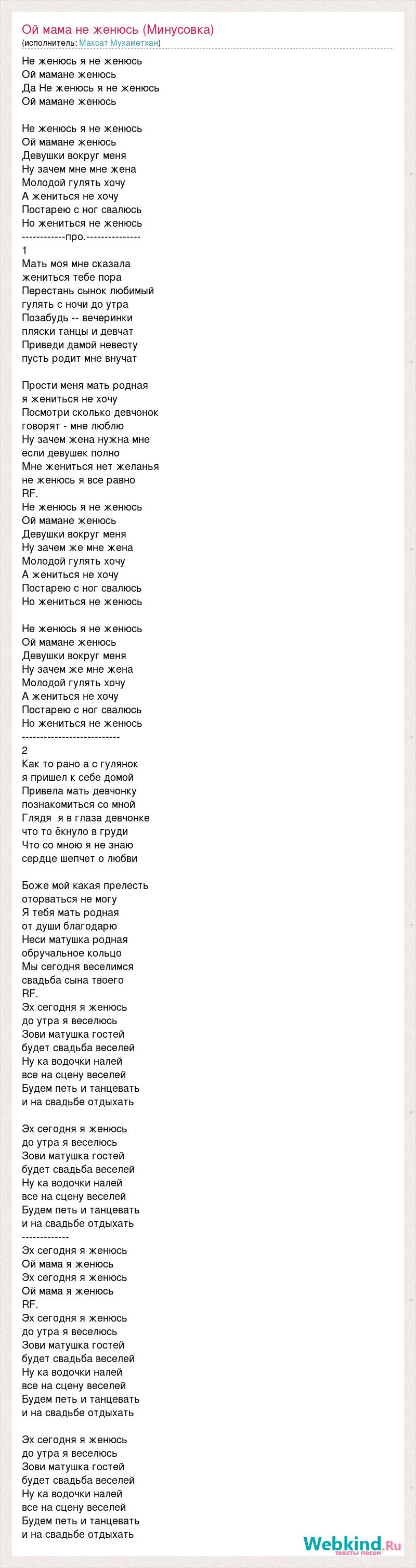 Не женюсь я не женюсь Ой мамане женюсь Да Не женюсь я не женюсь Ой мамане женюсь Не женюсь я не женюсь Ой мамане женюсь Девушки вокруг меня Ну зачем мне мне жена Молодой гулять хочу А жениться не хочу Постарею с ног свалюсь Но жениться не женюсь ------------про.--------------- 1 Мать моя мне сказала жениться тебе пора Перестань сынок любимый гулять с ночи до утра Позабудь -- вечеринки пляски танцы и девчат Приведи дамой невесту пусть родит мне внучат Прости меня мать родная я жениться не хочу Посмотри сколько девчонок говорят - мне люблю Ну зачем жена нужна мне если девушек полно Мне жениться нет желанья не женюсь я все равно RF. Не женюсь я не женюсь Ой мамане женюсь Девушки вокруг меня Ну зачем же мне жена Молодой гулять хочу А жениться не хочу Постарею с ног свалюсь Но жениться не женюсь Не женюсь я не женюсь Ой мамане женюсь Девушки вокруг меня Ну зачем же мне жена Молодой гулять хочу А жениться не хочу Постарею с ног свалюсь Но жениться не женюсь --------------------------- 2 Как то рано а с гулянок я пришел к себе домой Привела мать девчонку познакомиться со мной Глядя я в глаза девчонке что то ёкнуло в груди Что со мною я не знаю сердце шепчет о любви Боже мой какая прелесть оторваться не могу Я тебя мать родная от души благодарю Неси матушка родная обручальное кольцо Мы сегодня веселимся свадьба сына твоего RF. Эх сегодня я женюсь до утра я веселюсь Зови матушка гостей будет свадьба веселей Ну ка водочки налей все на сцену веселей Будем петь и танцевать и на свадьбе отдыхать Эх сегодня я женюсь до утра я веселюсь Зови матушка гостей будет свадьба веселей Ну ка водочки налей все на сцену веселей Будем петь и танцевать и на свадьбе отдыхать ------------- Эх сегодня я женюсь Ой мама я женюсь Эх сегодня я женюсь Ой мама я женюсь RF. Эх сегодня я женюсь до утра я веселюсь Зови матушка гостей будет свадьба веселей Ну ка водочки налей все на сцену веселей Будем петь и танцевать и на свадьбе отдыхать Эх сегодня я женюсь до утра я веселюсь Зови матушка гостей будет свадьба веселей Ну ка водочки налей все на сцену веселей Будем петь и танцевать и на свадьбе отдыхать