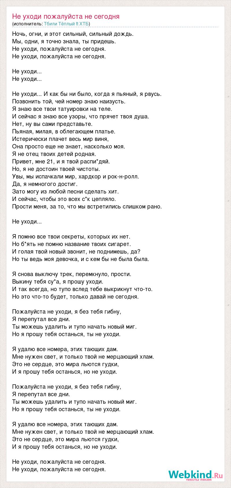 Ночь, огни, и этот сильный, сильный дождь. Мы, одни, я точно знала, ты придешь. Не уходи, пожалуйста не сегодня. Не уходи, пожалуйста не сегодня. Не уходи... Не уходи... Не уходи... И как бы ни было, когда я пьяный, я рвусь. Позвонить той, чей номер знаю наизусть. Я знаю все твои татуировки на теле. И сейчас я знаю все узоры, что прячет твоя душа. Нет, ну вы сами представьте. Пьяная, милая, в облегающем платье. Истерически плачет весь мир виня, Она просто еще не знает, насколько моя. Я не отец твоих детей родная. Привет, мне 21, и я твой распи*дяй. Но, я не достоин твоей чистоты. Увы, мы испачкали мир, хардкор и рок-н-ролл. Да, я немногого достиг. Зато могу из любой песни сделать хит. И сейчас, чтобы это всех с*к цепляло. Прости меня, за то, что мы встретились слишком рано. Не уходи... Я помню все твои секреты, которых их нет. Но б*ять не помню название твоих сигарет. И голая твой новый звонит, не поднимешь, да? Но ты ведь моя девочка, и с кем бы не была была. Я снова выключу трек, перемкнуло, прости. Выкину тебя су*а, я прошу уходи. И так всегда, но тупо вслед тебе выкрикнут что-то. Но это что-то будет, только давай не сегодня. Пожалуйста не уходи, я без тебя гибну, Я перепутал все дни. Ты можешь удалить и тупо начать новый миг. Но я прошу тебя останься, ты не уходи. Я удалю все номера, этих тающих дам. Мне нужен свет, и только твой не мерцающий хлам. Это не сердце, это мира льются гудки, И я прошу тебя останься, но не уходи. Пожалуйста не уходи, я без тебя гибну, Я перепутал все дни. Ты можешь удалить и тупо начать новый миг. Но я прошу тебя останься, ты не уходи. Я удалю все номера, этих тающих дам. Мне нужен свет, и только твой не мерцающий хлам. Это не сердце, это мира льются гудки, И я прошу тебя останься, но не уходи. Не уходи, пожалуйста не сегодня. Не уходи, пожалуйста не сегодня.