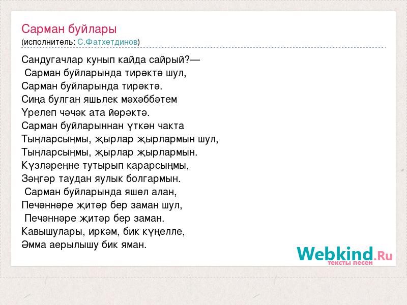 Сандугачлар кунып кайда сайрый?— Сарман буйларында тирәктә шул, Сарман буйларында тирәктә. Сиңа булган яшьлек мәхәббәтем Үрелеп чәчәк ата йөрәктә. Сарман буйларыннан үткән чакта Тыңларсыңмы, җырлар җырлармын шул, Тыңларсыңмы, җырлар җырлармын. Күзләреңне тутырып карарсыңмы, Зәңгәр таудан яулык болгармын. Сарман буйларында яшел алан, Печәннәре җитәр бер заман шул, Печәннәре җитәр бер заман. Кавышулары, иркәм, бик күңелле, Әмма аерылышу бик яман.