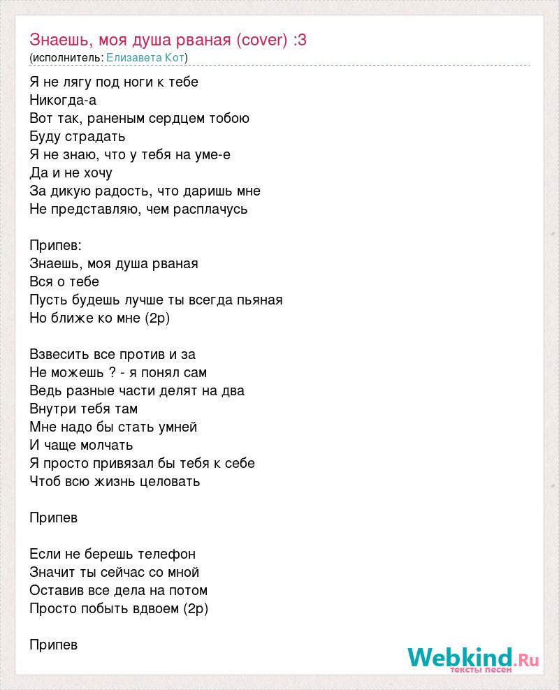 Я не лягу под ноги к тебе Никогда-а Вот так, раненым сердцем тобою Буду страдать Я не знаю, что у тебя на уме-е Да и не хочу За дикую радость, что даришь мне Не представляю, чем расплачусь Припев: Знаешь, моя душа рваная Вся о тебе Пусть будешь лучше ты всегда пьяная Но ближе ко мне (2р) Взвесить все против и за Не можешь ? - я понял сам Ведь разные части делят на два Внутри тебя там Мне надо бы стать умней И чаще молчать Я просто привязал бы тебя к себе Чтоб всю жизнь целовать Припев Если не берешь телефон Значит ты сейчас со мной Оставив все дела на потом Просто побыть вдвоем (2р) Припев